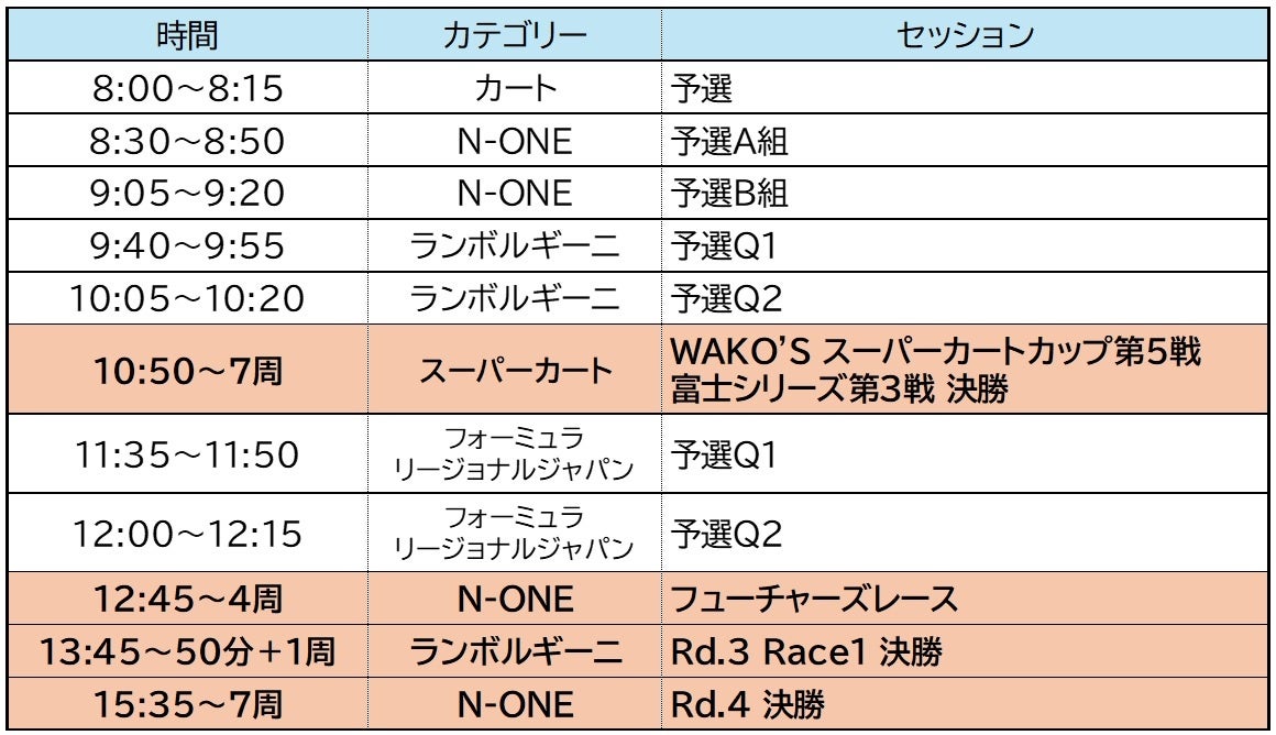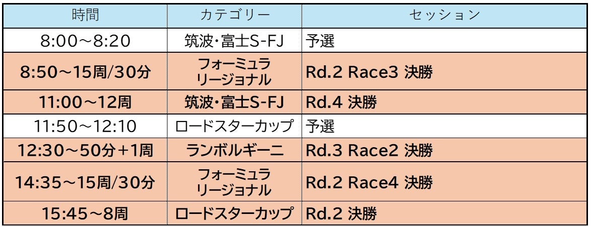 本大会は、イタリアのスーパーカー「ランボルギーニ」によるワンメイクレースをはじめ、ホンダの軽自動車「N-ONE」の参加型レース「N-ONE OWNER’S CUP」、マツダ・ロードスターによるワンメイクレース、フォーミュラカーのジュニアカテゴリーとして「FORMULA REGIONAL JAPANESE CHAMPIONSHIP」および「筑波・富士S-FJ選手権」が行われるなど、2日間で9レースを開催します。