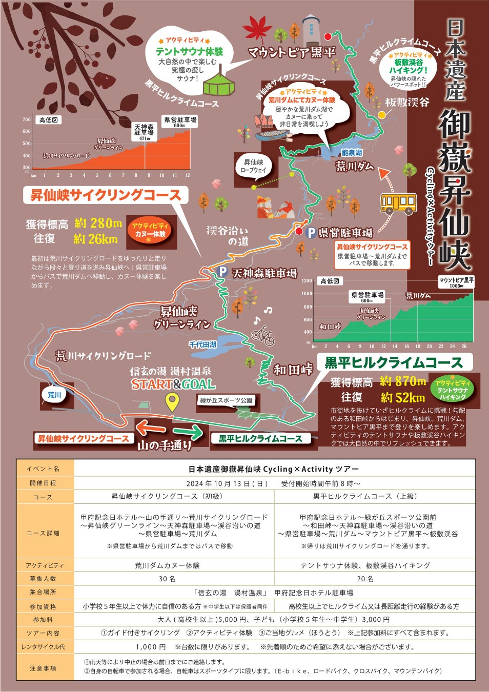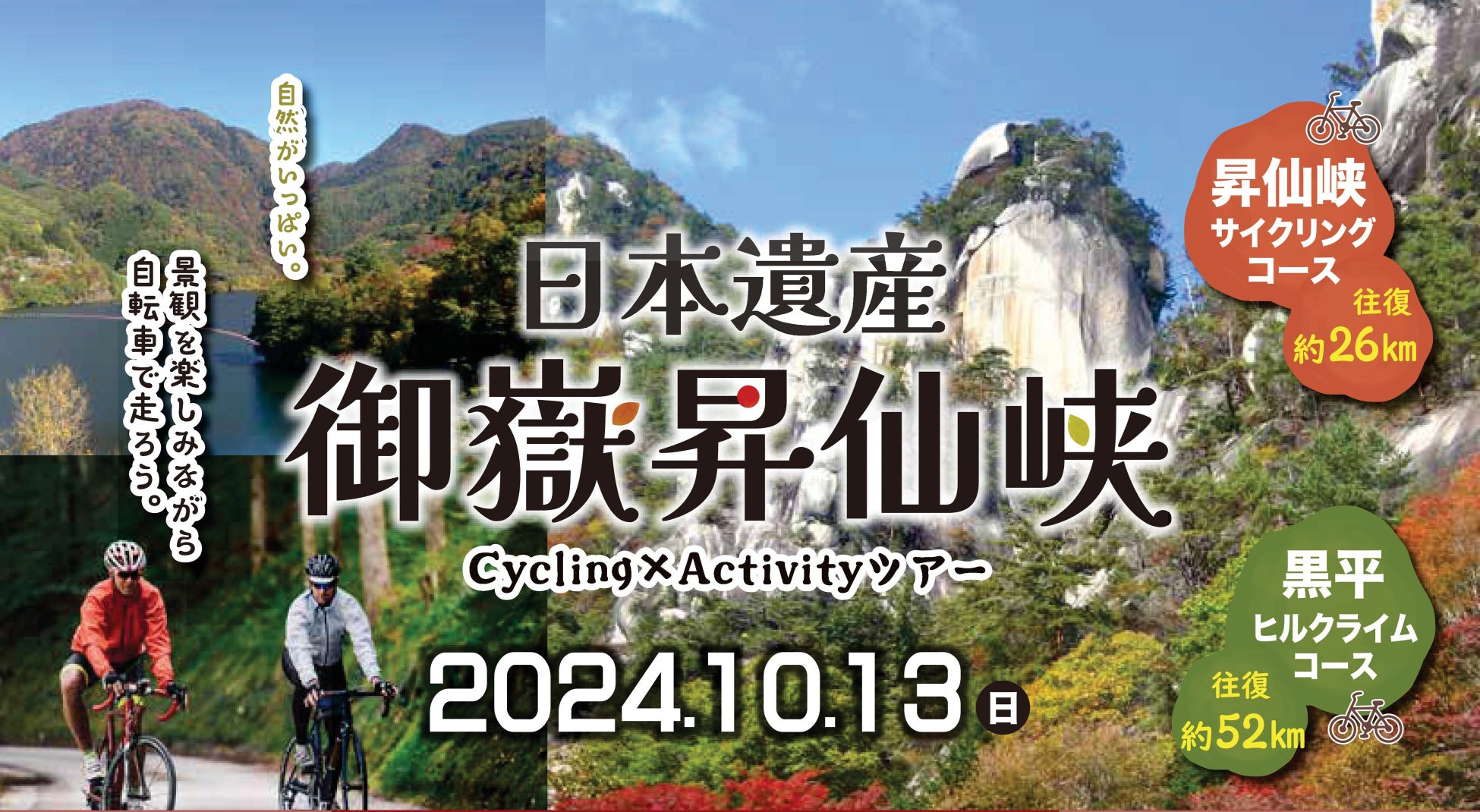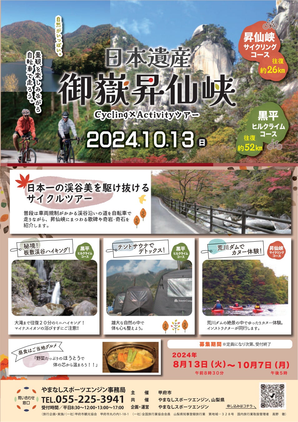 地域スポーツコミッション「やまなしスポーツエンジン」が企画・運営を行い、日本遺産に登録された昇仙峡周辺の地域で「日本遺産御嶽昇仙峡サイクリング×アクティビティツアー」を令和6年10月13日(日)に初開催します。