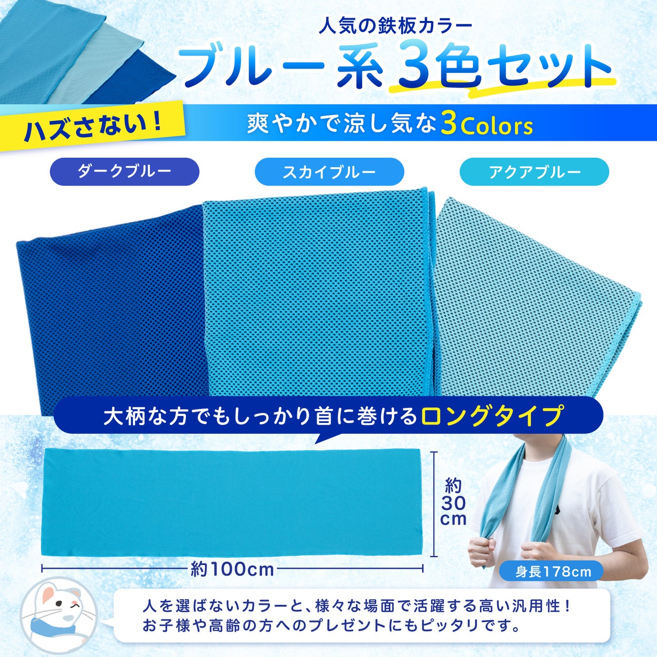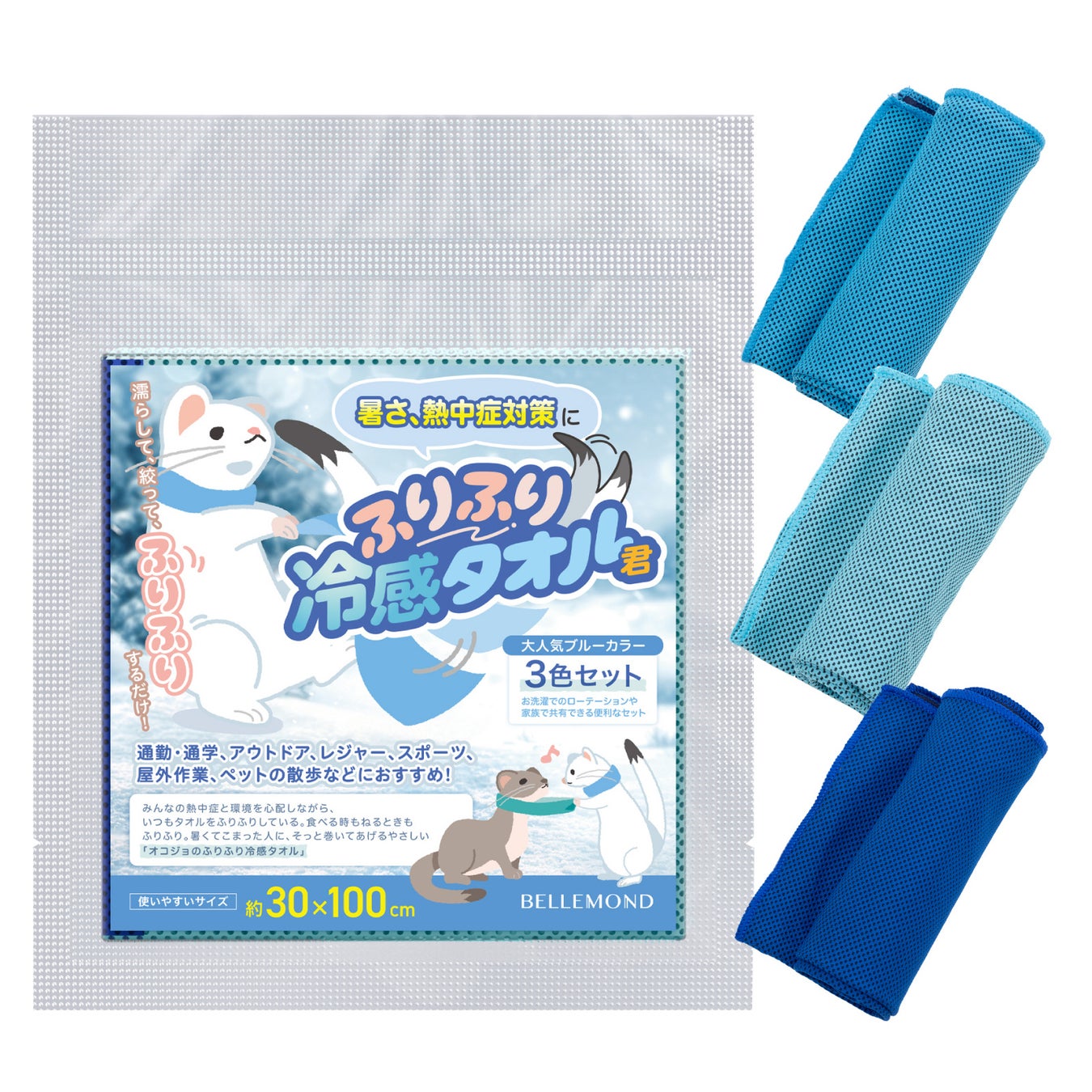 人気のブルー系だけで揃えた「ブルー3色セット」濡らして振ると冷たくなって、首に巻くだけで身体が冷える!初めての接触冷感タオルに可愛いオコジョの『ふりふり冷感タオル君』をぜひお試しください。