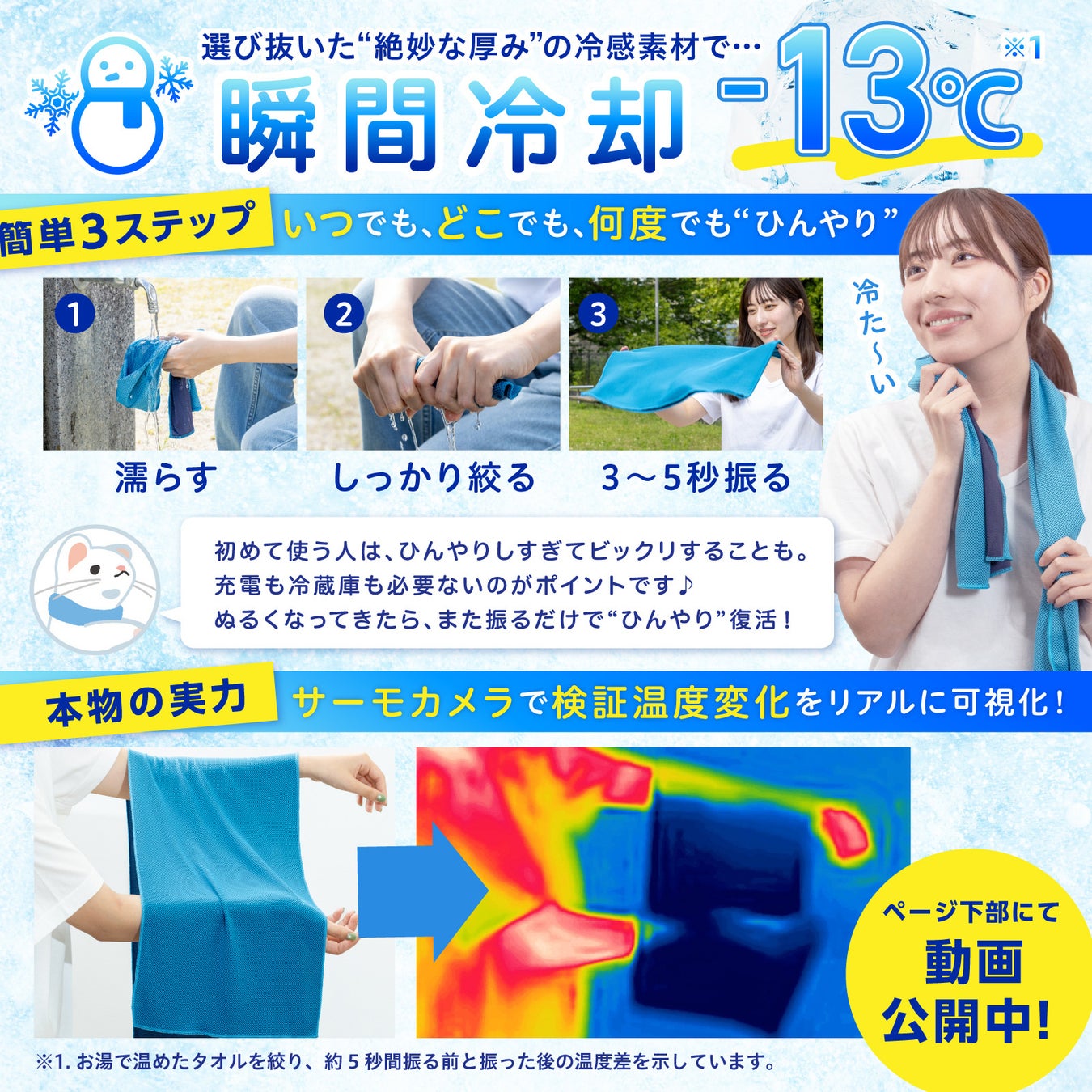 濡らして振るだけ瞬間冷却-13℃『ふりふり冷感タオル君』新発売!農作業・登山・運動・通勤通学中の熱中症対策に役立つ暑さ対策グッズ。98%UVカット、ひんやり冷たいクールタオルで夏の日差しを乗り切ろう!