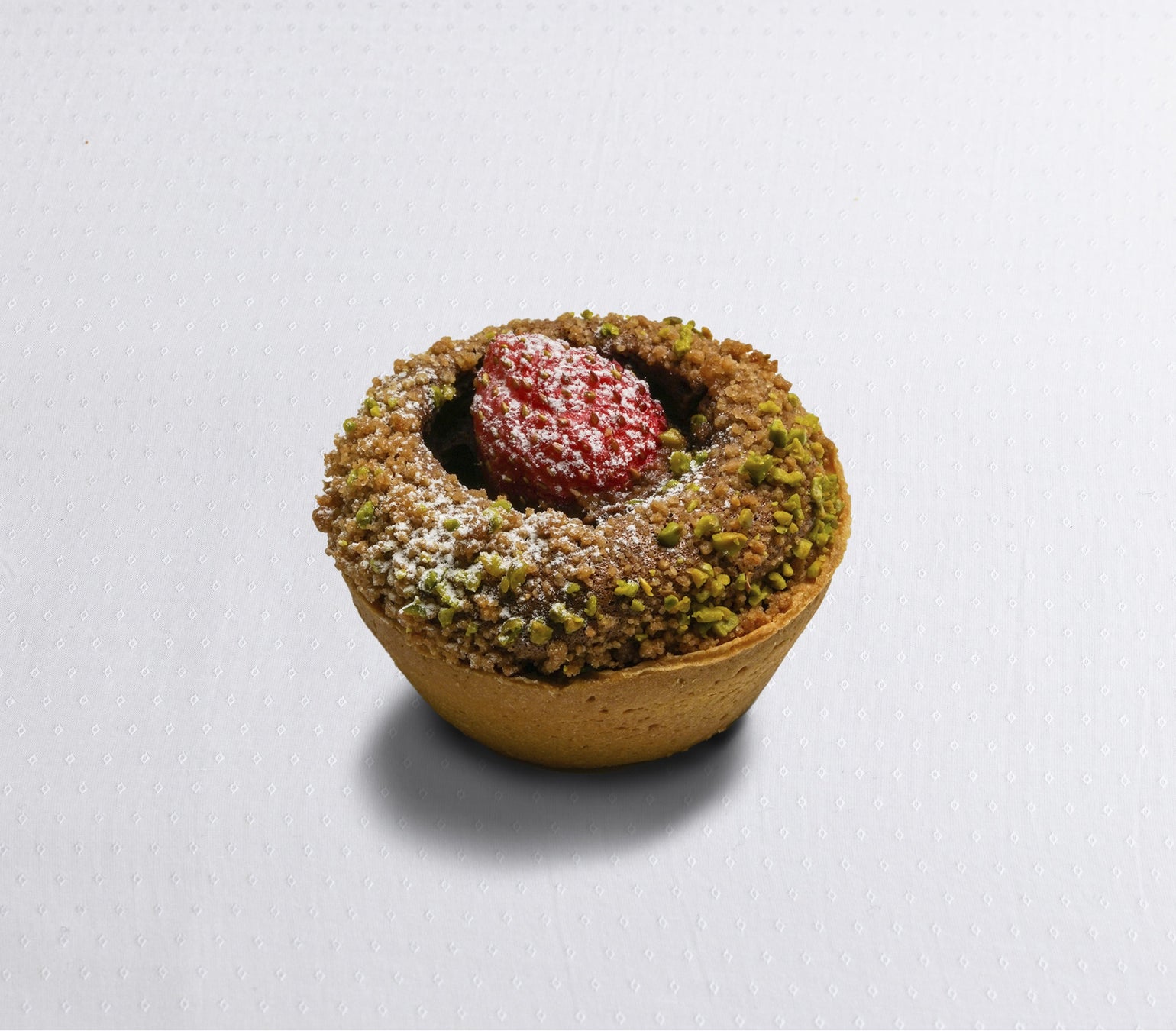 ピスタチオガナッシュを忍ばせいちごをトッピングした、温めても冷たくても美味しいフォンダンショコラタルトです。