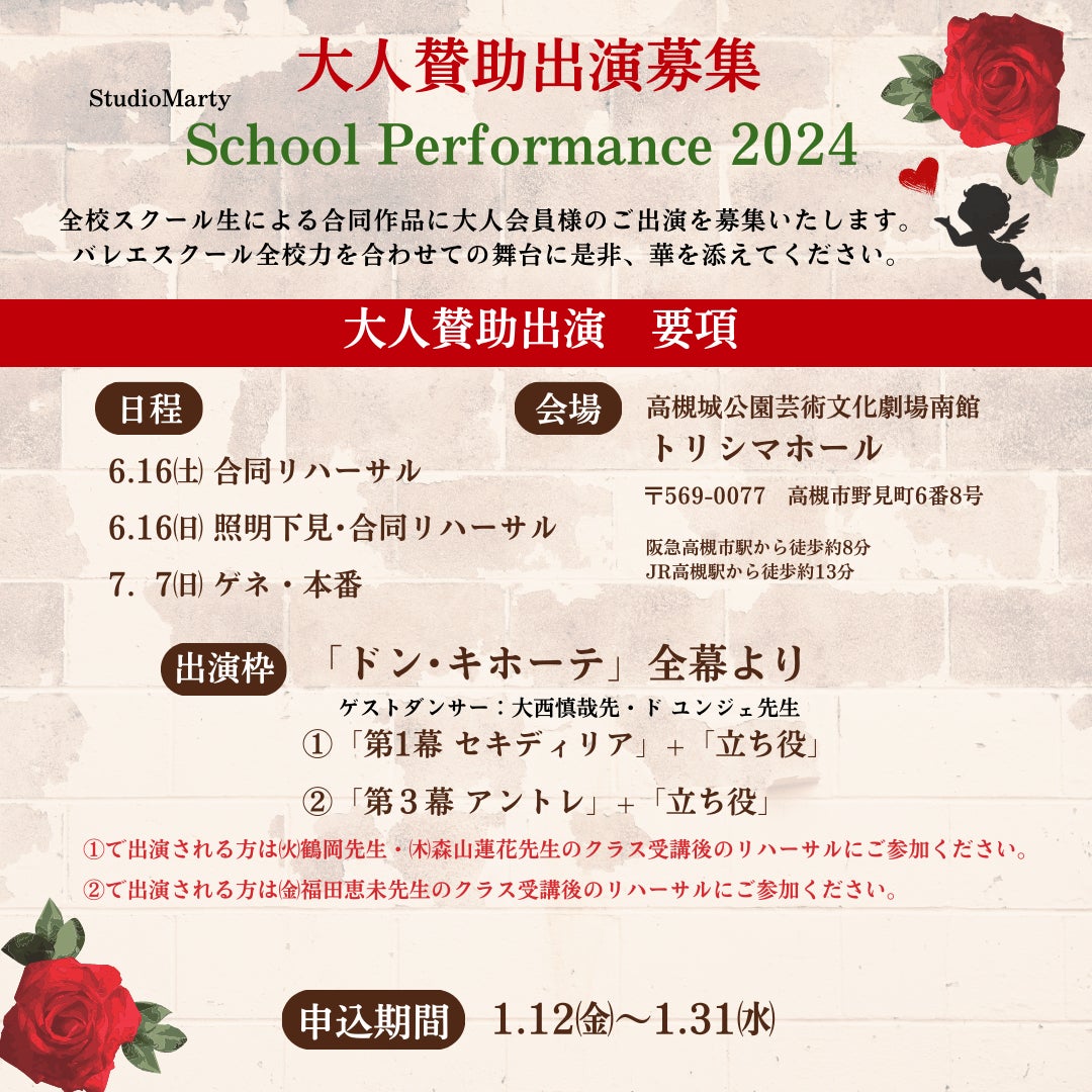 2024年7月、スタジオマーティプレゼンツ『Ballet School Performance 2024』にて「ドン・キホーテ」を上演いたします。子供たちがメインとなる舞台ですが、過去の開催では大人バレエの皆様も輝くことができる発表会として、大人の方もたくさんの出演者がいらっしゃいます。憧れの全幕バレエに参加するチャンス、皆様ぜひご参加ください。