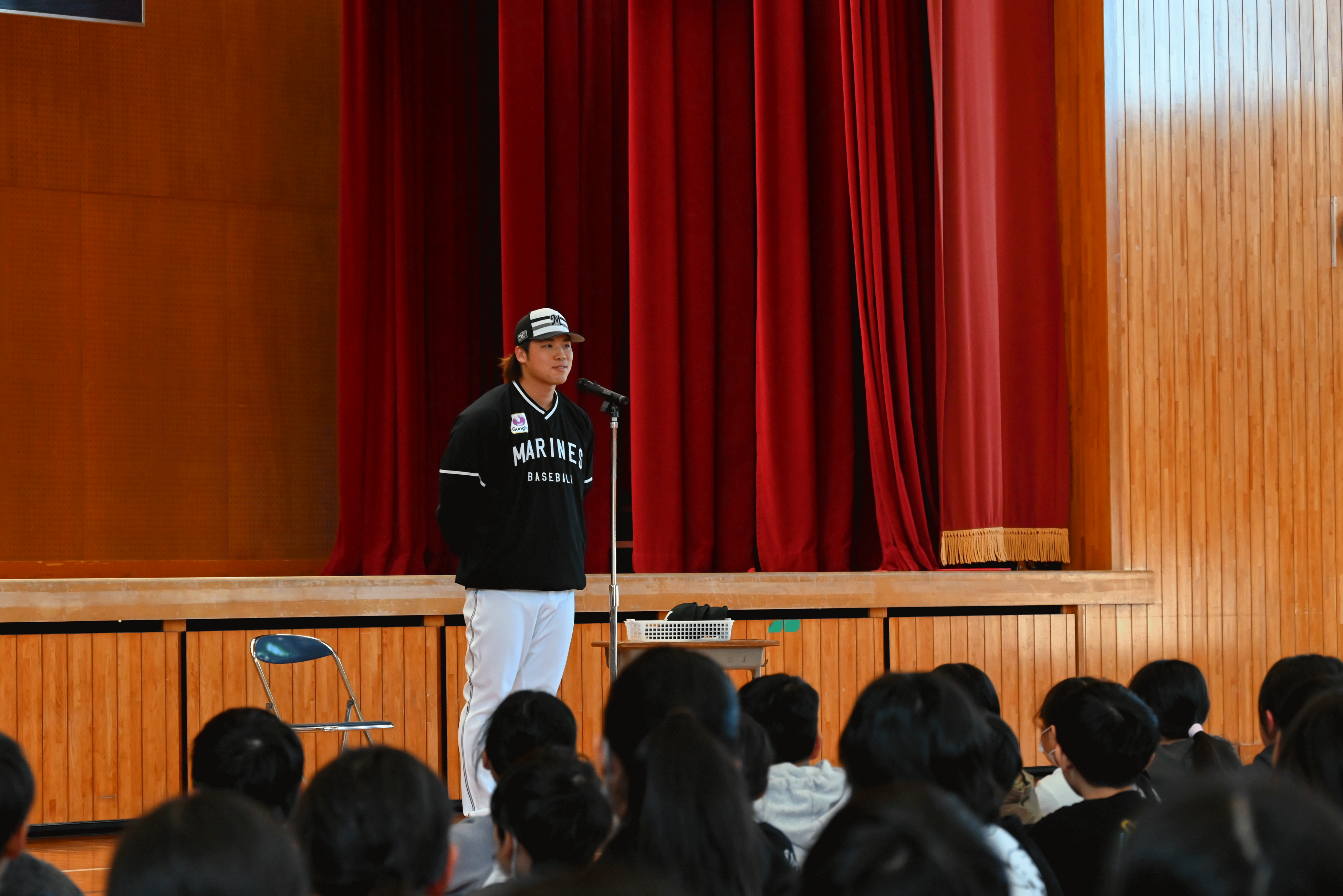 2月19日㈭には、森遼大朗投手が母校の五十市小学校を訪問し、後輩たちにキャップを手渡ししました。プロ野球で活躍する先輩からの特別なプレゼントを、児童らは大事そうにかぶっていました。