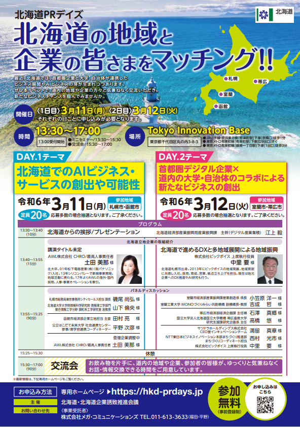 最近、北海道では、首都圏企業と大学、自治体が連携したビジネス展開やAIビジネスの芽が生まれつつあります。ぜひ本イベントで、道内の地域や企業の方々と気兼ねなく交流いただき、新たなビジネスチャンスを掴んでみませんか。