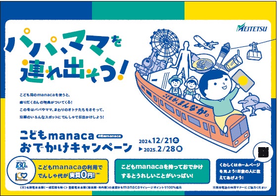 本年創業130周年を迎えた名古屋鉄道は、同じく本年創業100周年を迎えた豊橋鉄道と連携し、2024年12月21日から2025年2月28日まで、小児用manacaでご利用いただいた運賃相当額をmanacaマイレージポイントで全額還元する「こどもmanaca おでかけキャンペーン」を実施します。