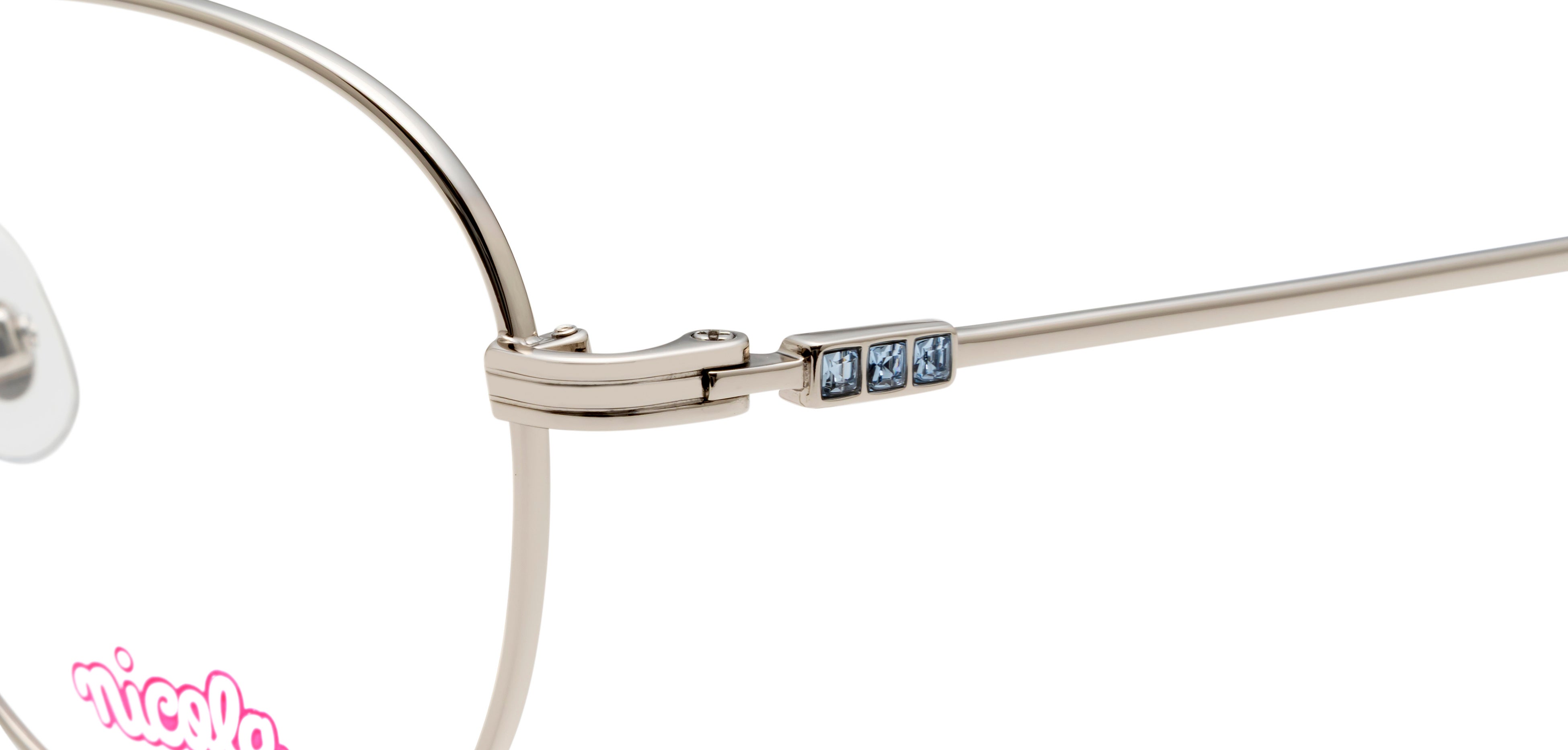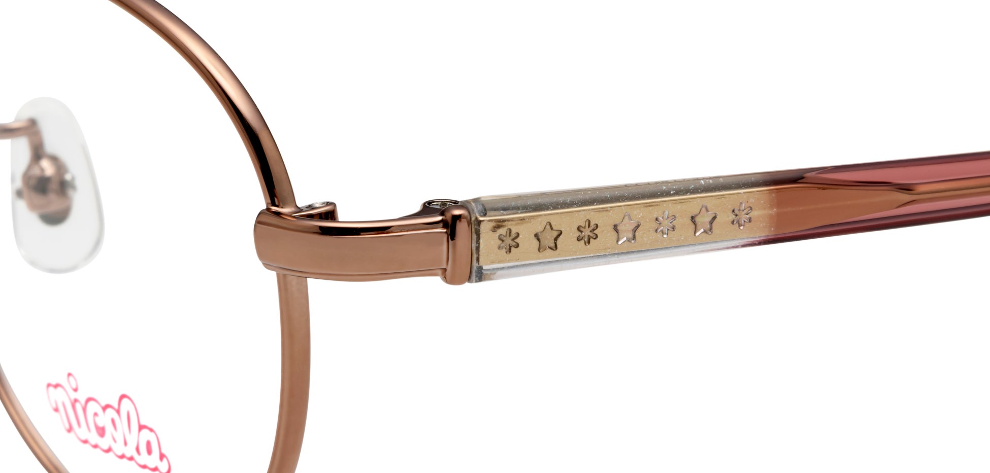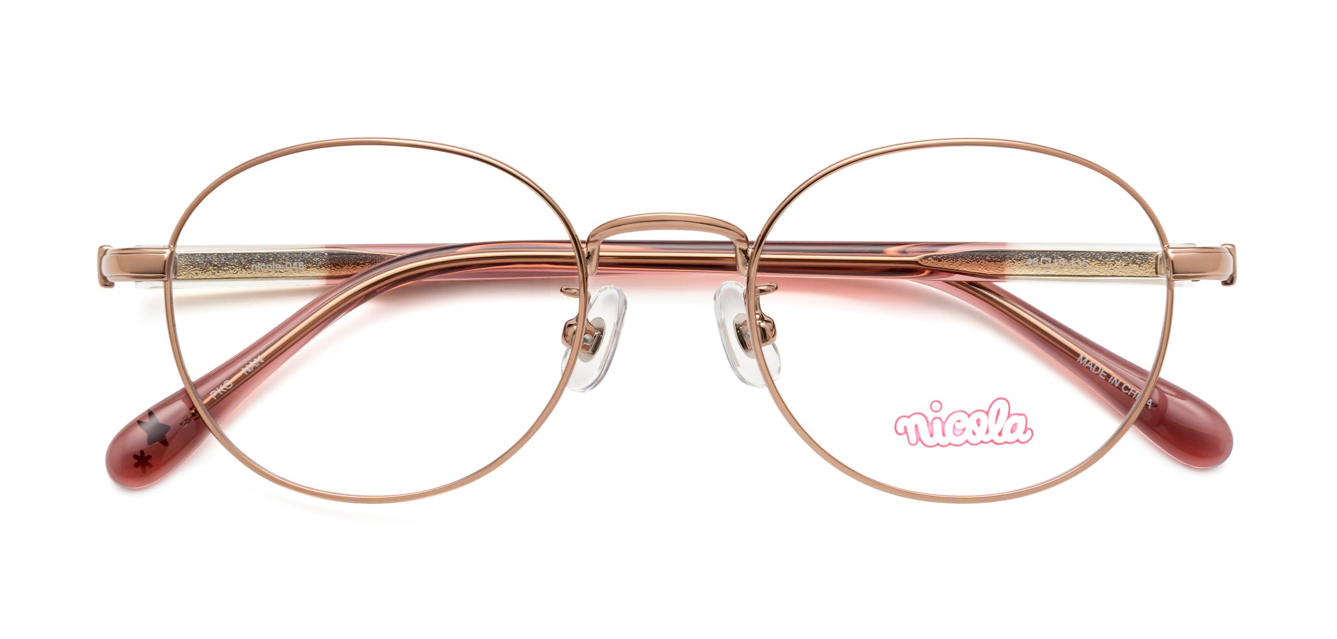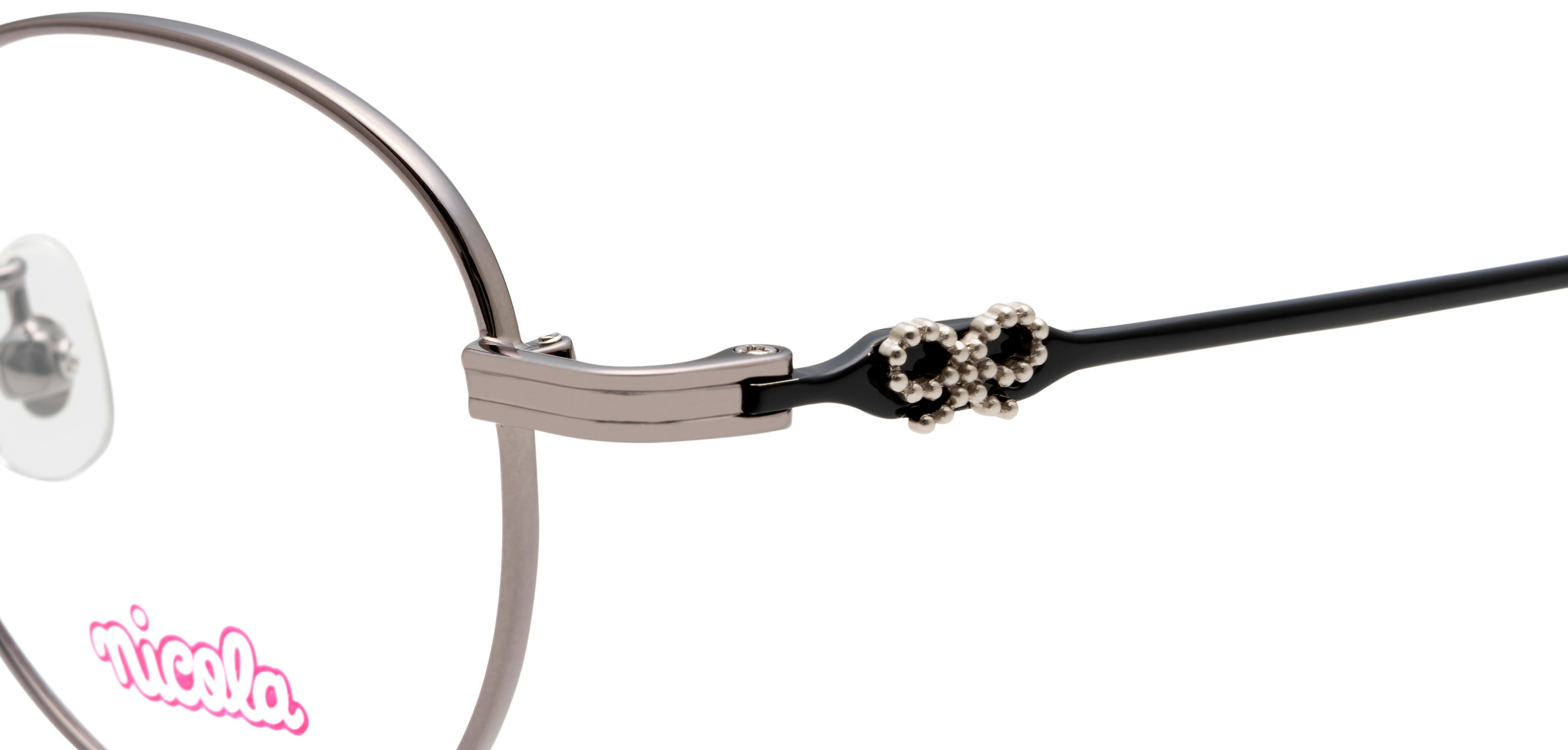 細身でシンプルなボストンメタルフレーム。特徴的なパールリボン風のパーツは、学校でも掛けやすいように左側のテンプルにのみ配置し、可愛さとシンプルさを両立しています。