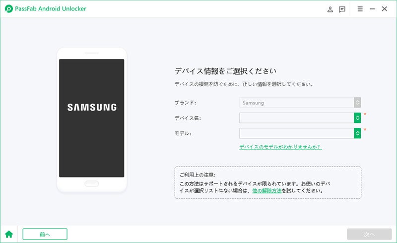 Samsungデバイスであれば、PassFab Android Unlockで初期化なしでパターンロックを解除できます。パソコンにデバイスを接続して、画面に沿って操作するだけで安全にパターンロックを解除することができます。また、Androidのバージョンが4.4以前の場合には、デバイスマネージャーから初期化せずにロックを解除することが可能です。ただし、下記の全ての条件を満たしている必要があります。