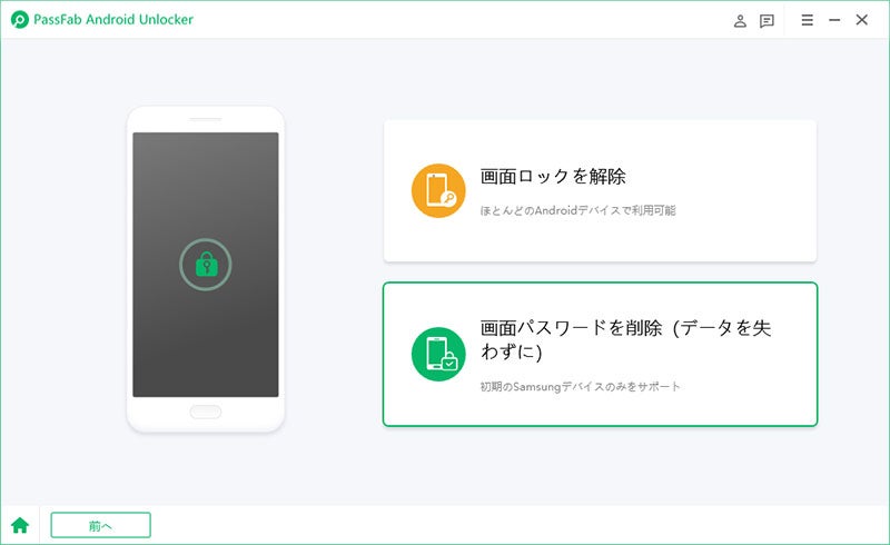 Step1:PassFab Android Unlockをパソコンにダウンロードして起動し、「画面ロックを解除」を選択します。