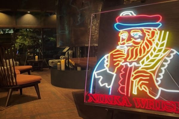 ニッカウヰスキーの魅力を味わえる銘柄として、「ニッカ セッション」と「シングルモルト余市」の2種類をご用意。ウイスキーを愉しんでいただく空間として約5mの暖炉が印象的な、ホテル万惣のフロントロビーを会場としております。また、19世紀のスコットランドで「ブレンデッドウイスキー」を広めたW・P・ローリー氏をモデルにつくられたニッカウヰスキーの象徴とも言えるキャラクターのネオンサインを会場に設置いたします。秋の夜空を眺めながらしっとりとした大人の空間をお愉しみいただけます。