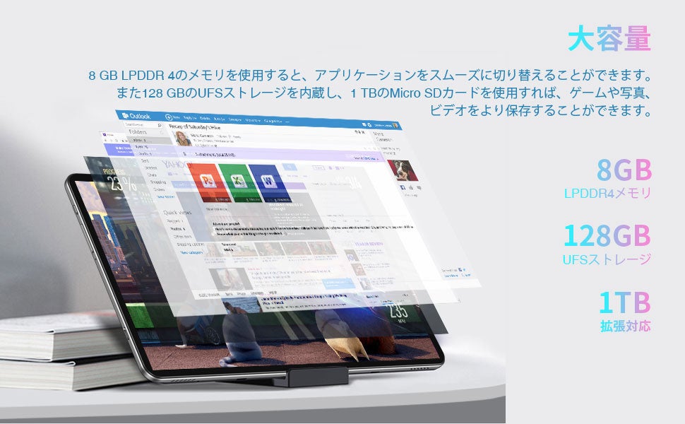 【MTK 8183 8コアCPU+8GB+128GB】このタブレットは、MTK 8183 8コアCPUと8GB RAM、128GBストレージを搭載しています。MediaTek 8183は、低消費電力の12nmプロセスで構築され、高性能なA73アーキテクチャの高性能コアを4つ備えています。Antutuベンチマークでは最大23万点をマークし、大型ゲームもスムーズに動作します。さらに、128GBのストレージ容量で、アプリ、動画、写真などをたくさん保存することができますので、容量の心配もありません。