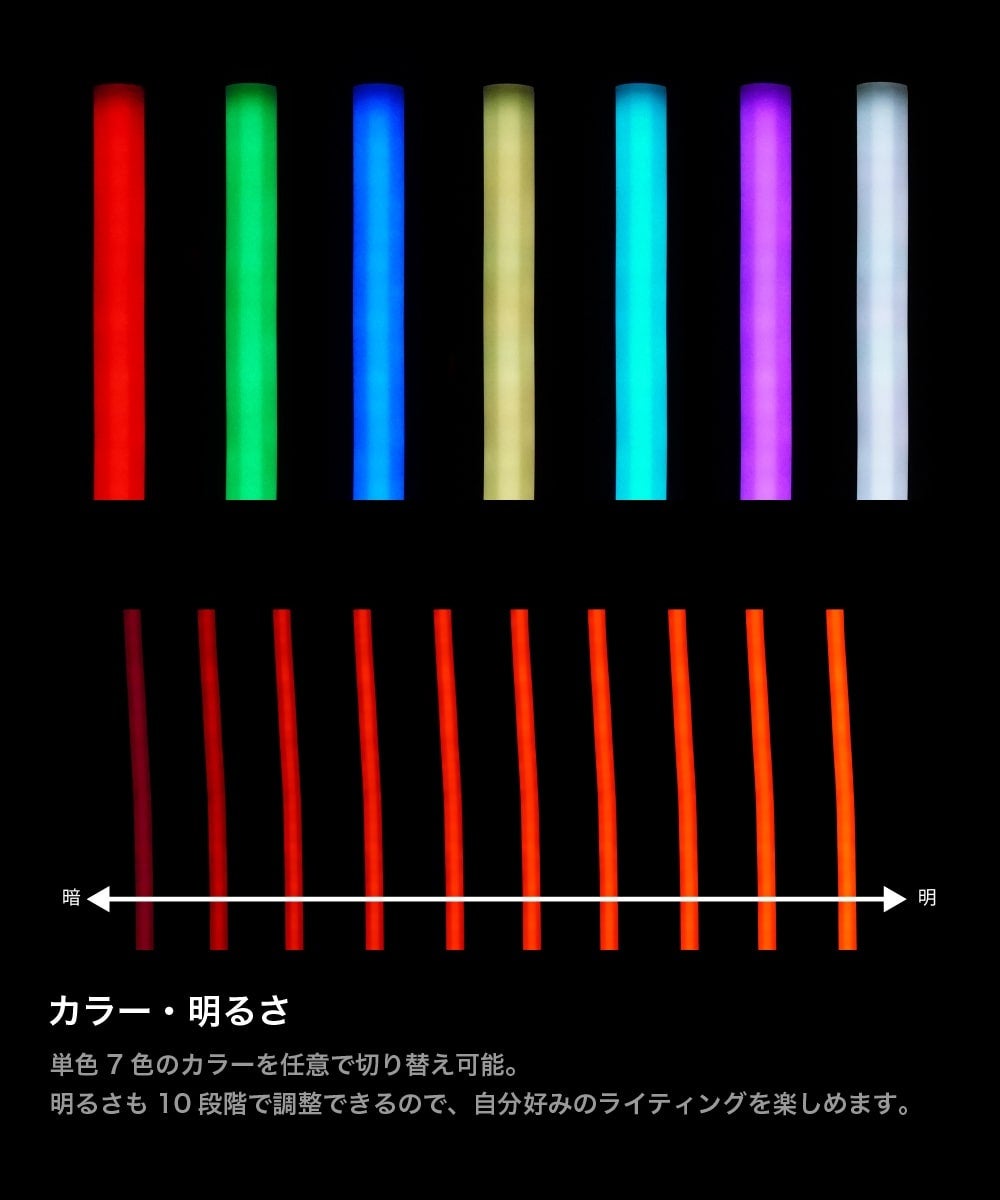 単色7色のカラーを任意で切り替え可能、明るさは10段階で調整ができます。