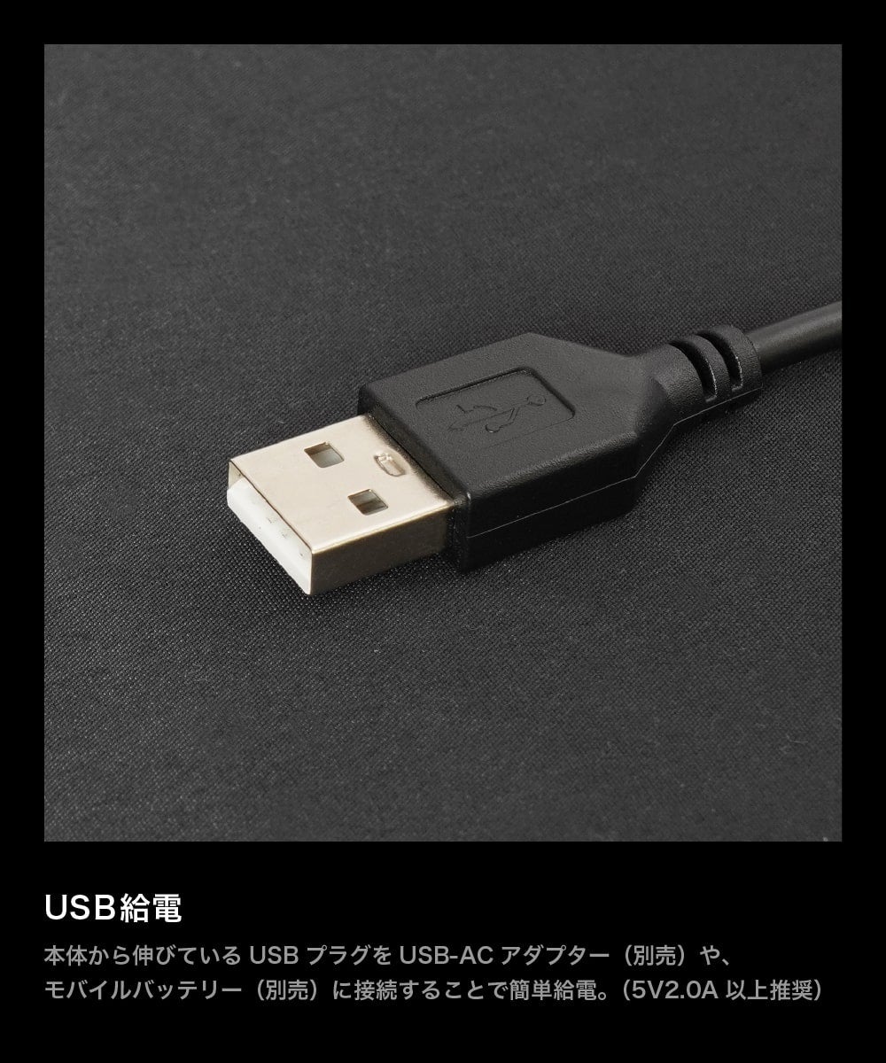 USB給電式でPCなどからの電源や、モバイルバッテリーからの給電でも使用可能。