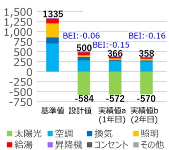 こうした取り組みにより、年間エネルギー消費量(実績値)でも『ZEB』を達成しています。また、ビルに関わるCO2排出量全体の削減を目標として、運用時の『ZEB』だけではなく、機器容量の縮減、冷媒量の低減、機器更新の容易化等、エンボディドカーボン(※5)削減にも取り組んでいます。