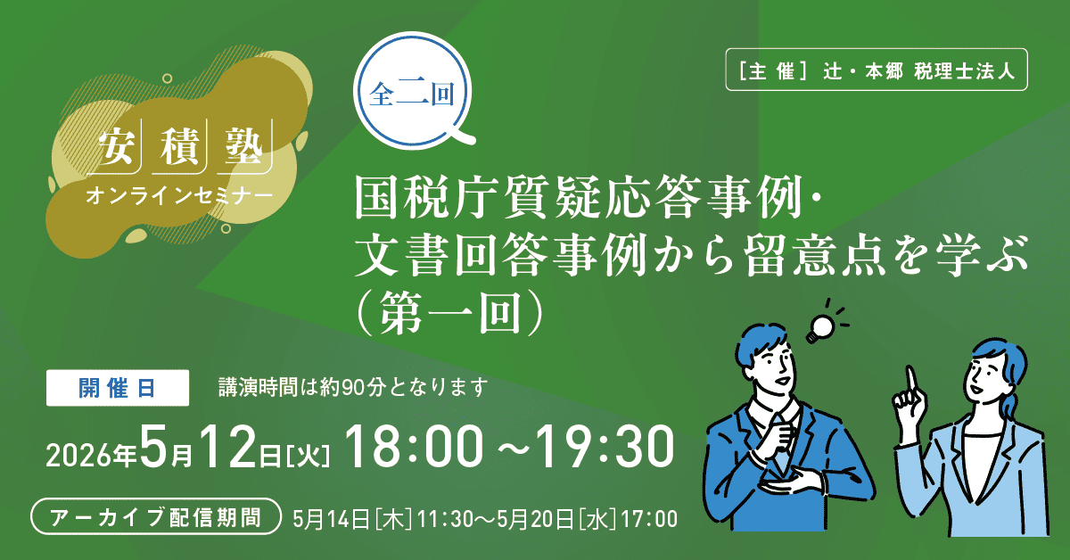 辻・本郷 税理士法人(本社:東京都新宿区、理事長:桑木小恵子)は、2026年5月12日(火)にオンラインセミナー「全二回 国税庁質疑応答事例・文書回答事例から留意点を学ぶ(第一回)」を開催いたします。