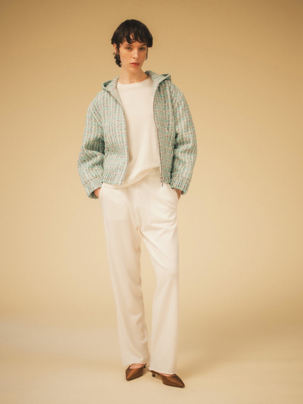 フェミニンな素材にマスキュリンなシルエットを掛け合わせ、さりげなくセクシーな魅力を纏うスタイルを生み出しているGABI GAMELからは、デッドストックやアップサイクル生地を採用したフーディージャケットがお目見え。
