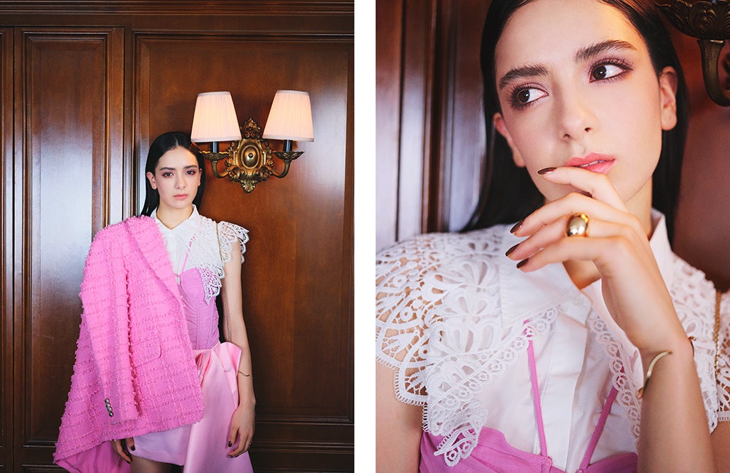 「甘すぎない大人のピンクがスタイリングテーマだったこちらは、要所にスタイリングのポイントが。大きなレースの襟も目を引くのですが、スカートにも大きなリボンがあしらわれていたり、ぼってりとしたツイードジャケットもこのスタイリングには欠かせません。全体的に甘いと思いきや、先の尖ったヒールやレザーバッグ、モデルの顔立ちによりバランスが取られています。」