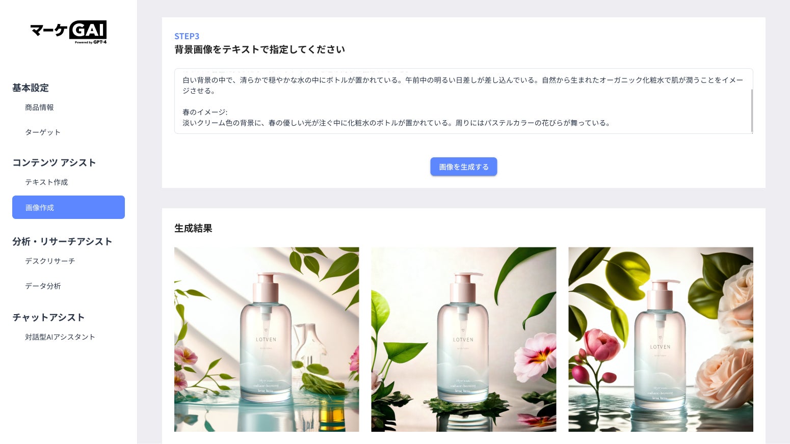 これにより、従来の企画・ライティング業務をより効率的に進められるようになっただけでなく、デスクリサーチから、SNS投稿画像生成、リーガルチェックに至るまで、マーケティングの幅広い領域における業務効率化をカバーできるようになります。