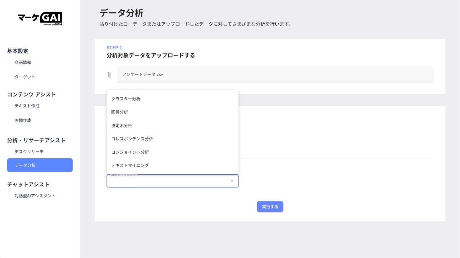 また、「分析」機能を活用することで、市場調査から取得したアンケートデータをアップロードし、それらに自動でクラスタ分析をかけることも可能です。この機能により、マーケターは調査結果から有意義なインサイトを効率的に導き出すことができます。