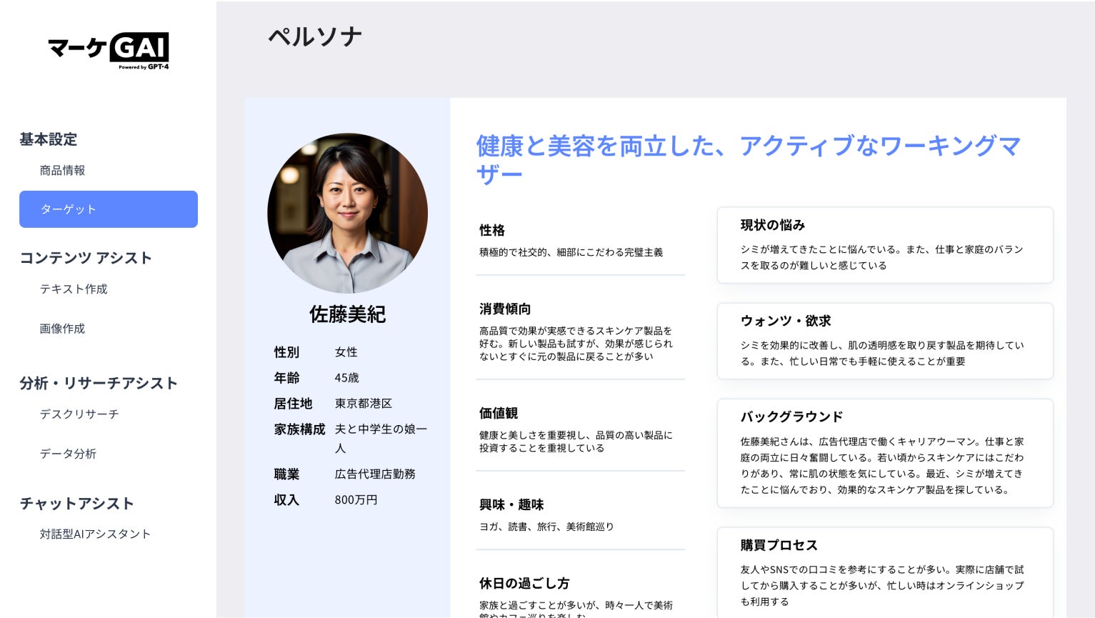 このようなAI活用におけるルーティン作業を効率化するため、「マーケGAI」ではターゲットおよび商品情報を登録し、必要に応じて呼び出せるように機能を改修いたしました。これにより、マーケティング担当者は毎回情報を入力する手間が省け、より効率的にAIを活用することが可能になります。