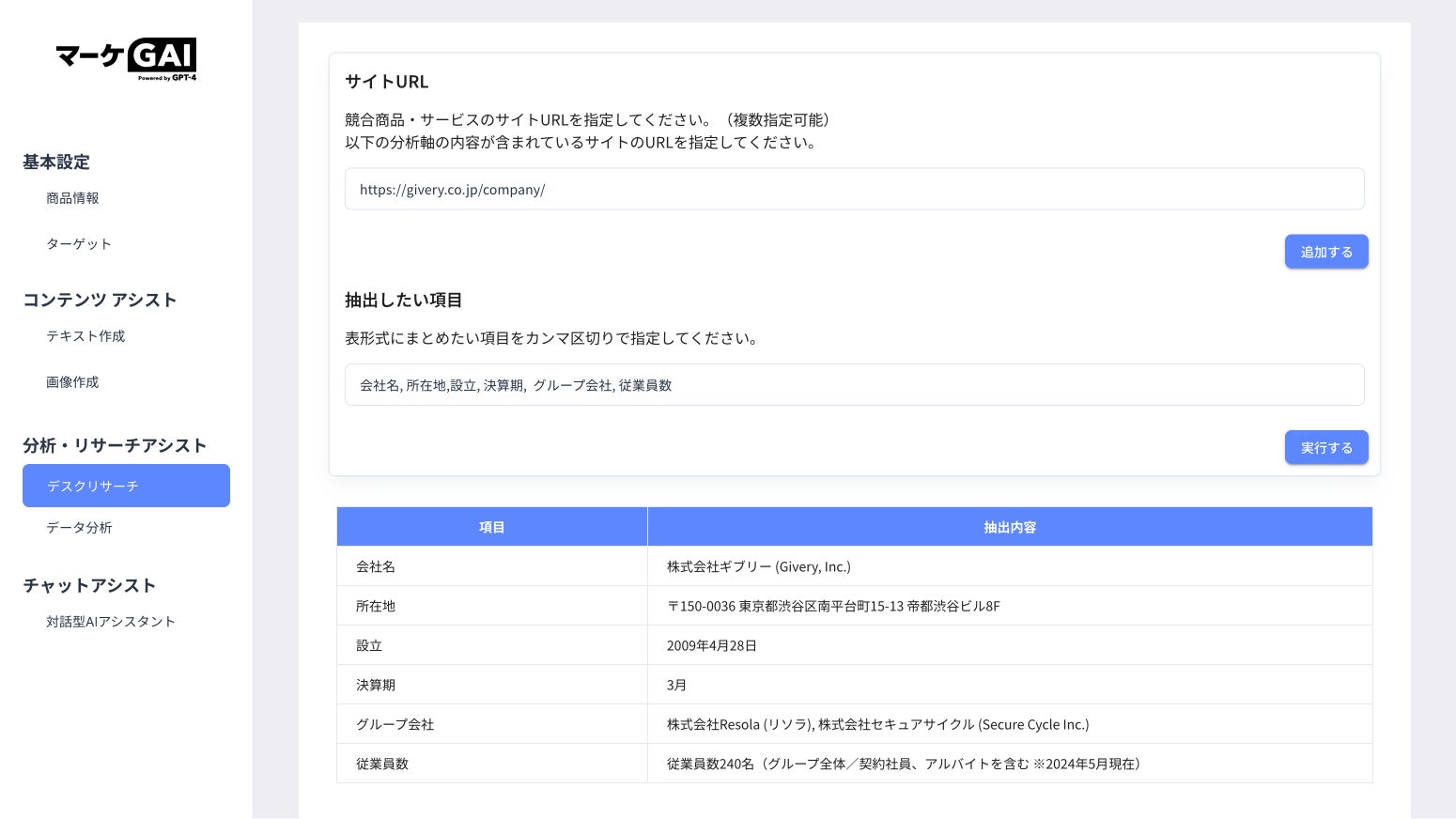 「マーケGAI」に新たに搭載された「デスクリサーチ」機能は、Webサイト情報を自動でクローリングし、指定の情報を収集してくれます。これにより、マーケターは手作業で情報を収集する時間と手間を大幅に削減することができます。