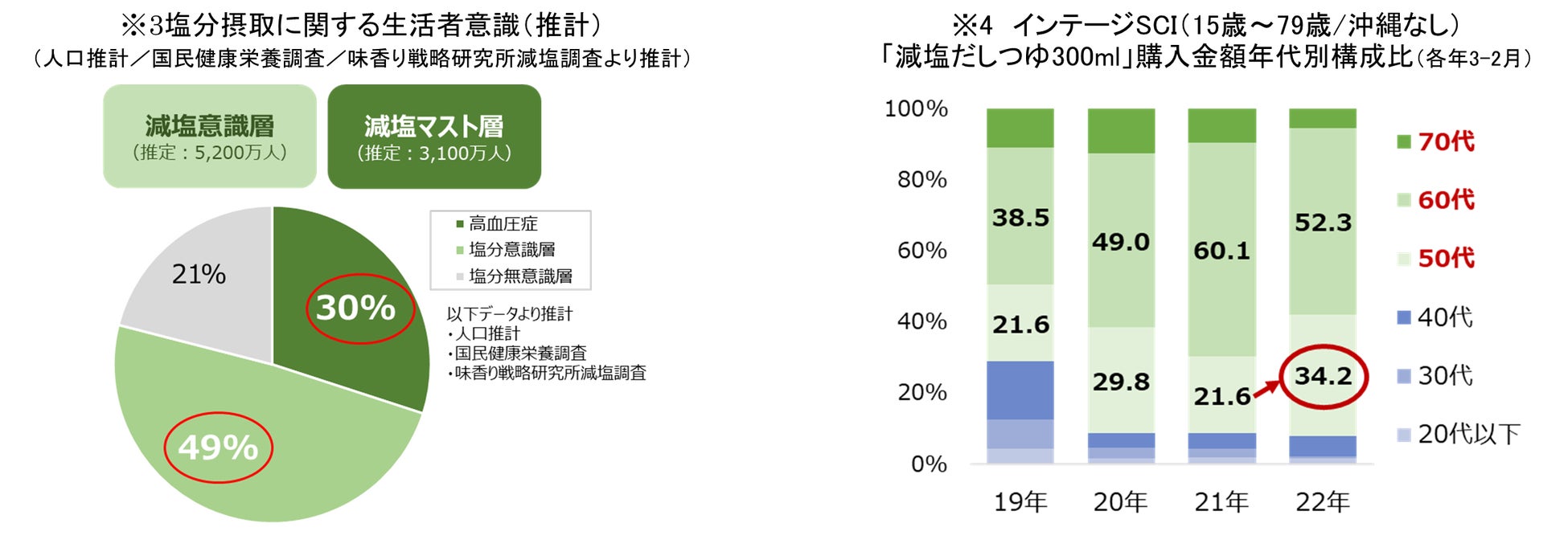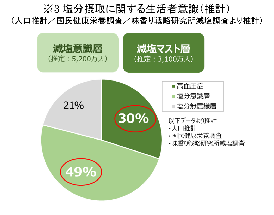 ヤマキでは、「高血圧症に悩む減塩マスト層(高血圧症等により減塩が必要な層)」と「塩分の取りすぎは良くないと健康に気遣っている減塩意識層(塩分が気になる層)」のニーズの異なる2つの層が存在すると考えています。塩分摂取に対する生活者の意識を推計したところ、「減塩マスト層」と「減塩意識層」は合わせて約8割にも及ぶことが分かりました(※3)。この実態を踏まえ、ヤマキはそれぞれの生活者ニーズにマッチした商品を揃えることにより、生活者の健康的な食生活を応援してまいりました。