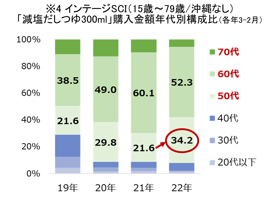 近年、「減塩だしつゆ」を購入してくださっている年齢層が引き下がってきていること(※4)に加えて、「今以上にたくさん使いたい」というお客様のご要望に応えて、新たな容量として「減塩だしつゆ 500ml」の発売に至りました。なお、「減塩だしつゆ 300ml」は、50 代以上で構成されている家庭など、世帯人数の少ないお客様にとって使いやすい容量であるため販売を継続します。