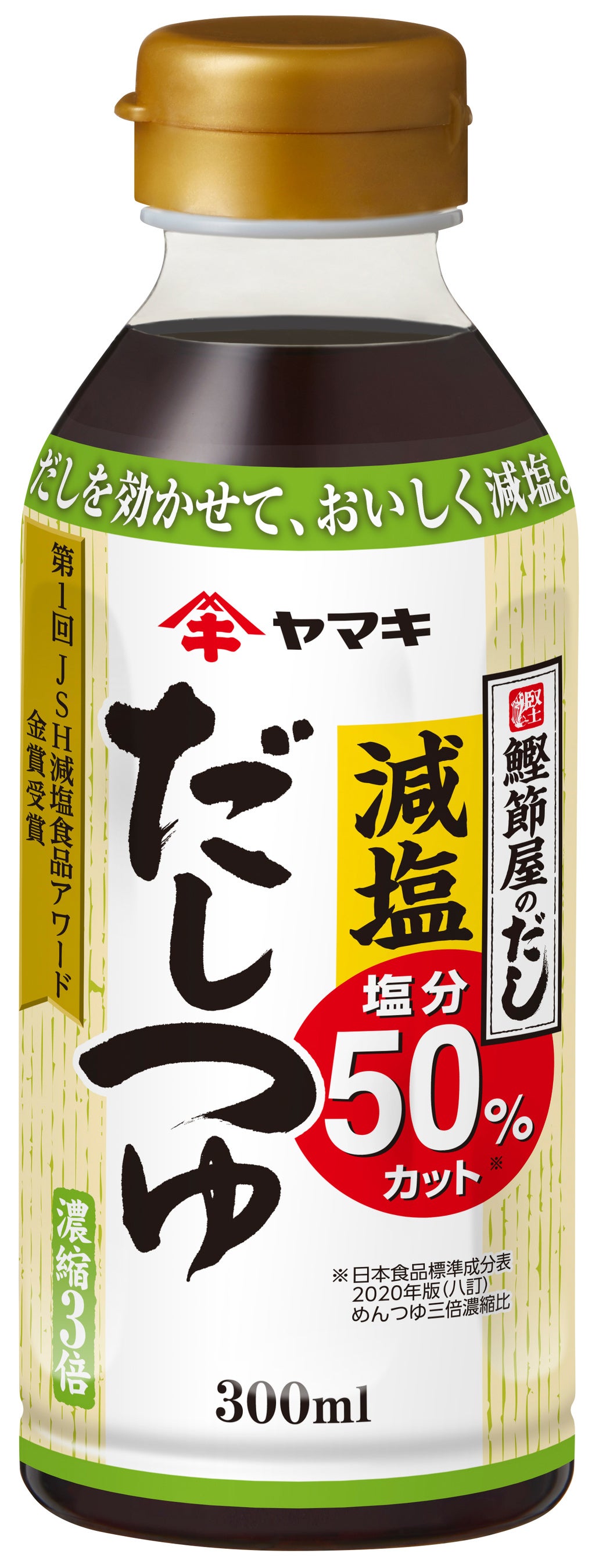 「減塩だしつゆ」はだしを効かせた塩分50%カットの濃縮 3 倍の減塩つゆです。2009 年の発売以来、減塩つゆ市場を牽引してきた商品であり、減塩マスト層に向けた商品となっています。「これ1本で味が決まるのに減塩タイプで体にも良く、おいしいので重宝している。」「これがないと塩分調整に手間がかかるので、なくてはならない商品。」「夫婦そろって血圧が高めなので使用している。」など、シニアの方を中心に好評いただいております。