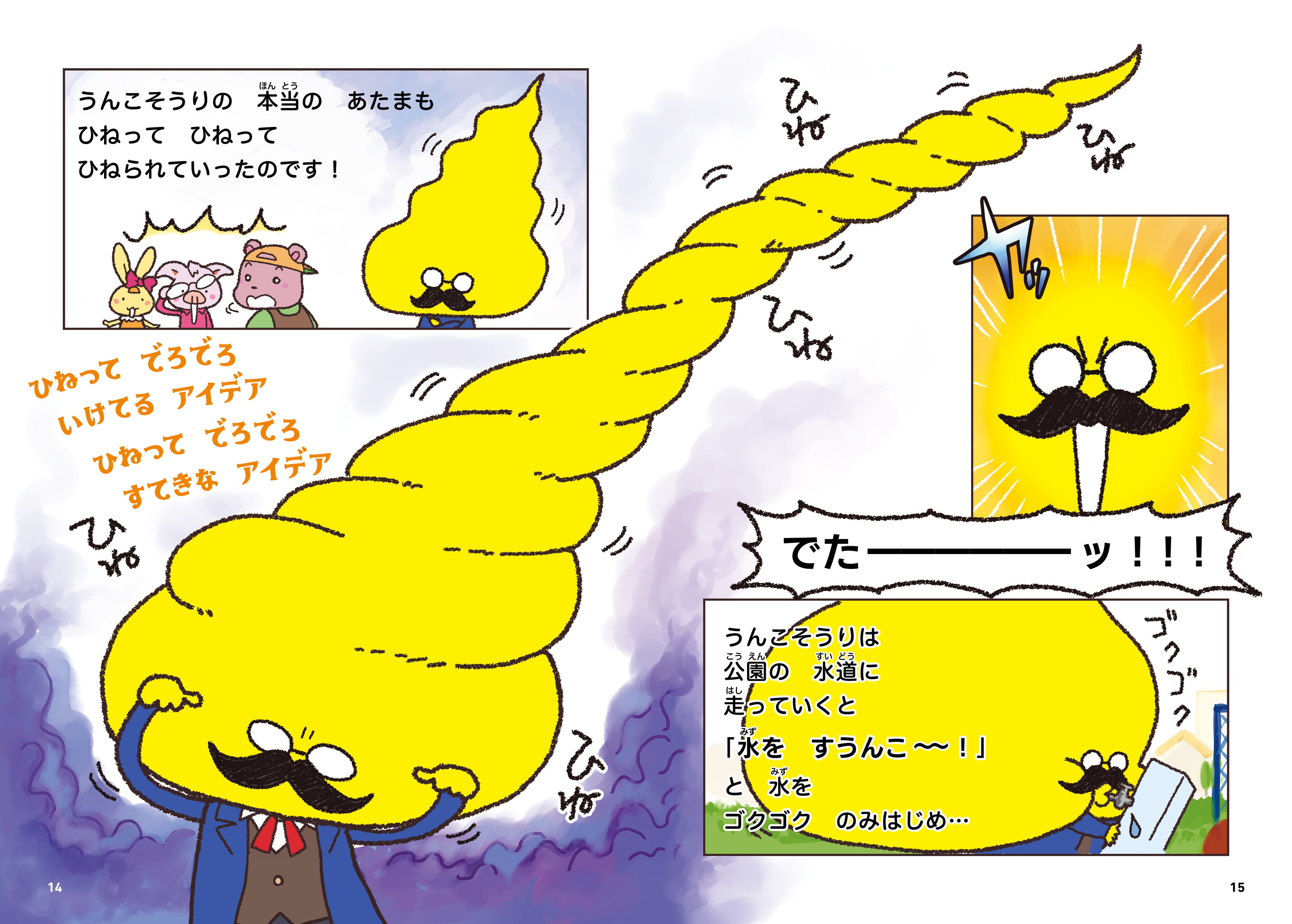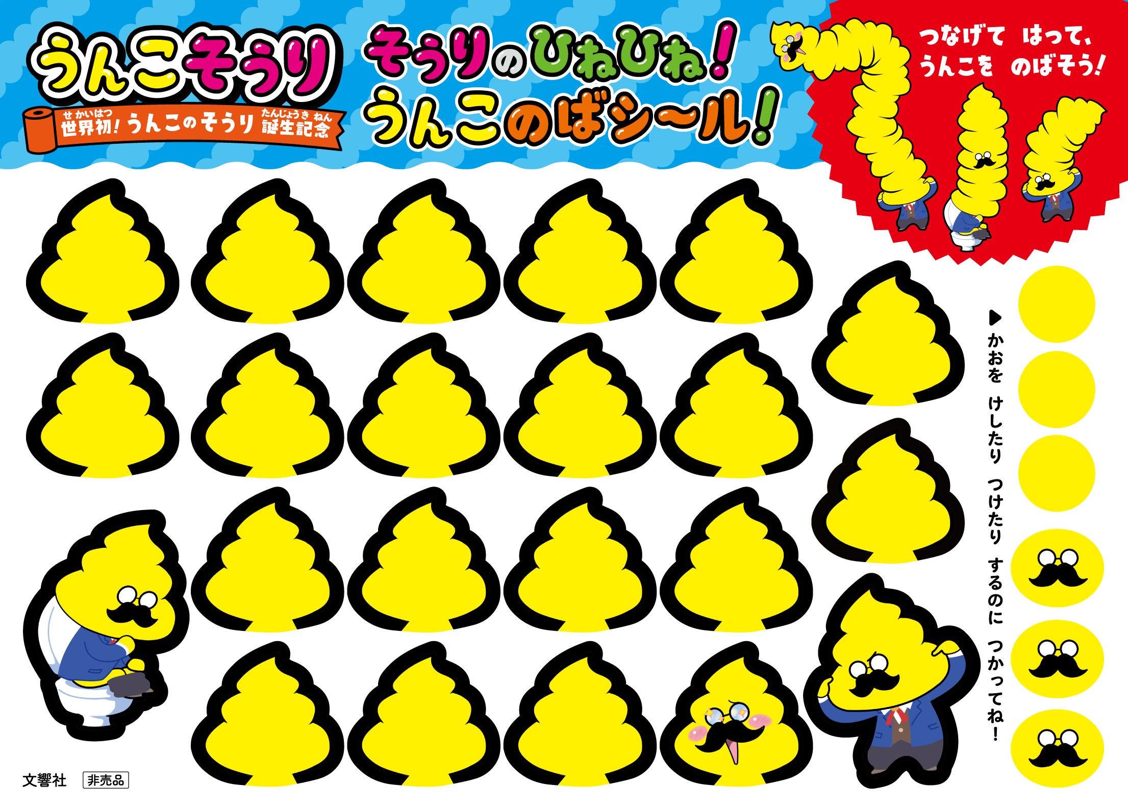 1作目の刊行を記念して、今作にはうんこ頭を伸ばすように貼って楽しめるおまけ「そうりのひねひね! うんこのばシール!」付きです。(※数に限りがあります)