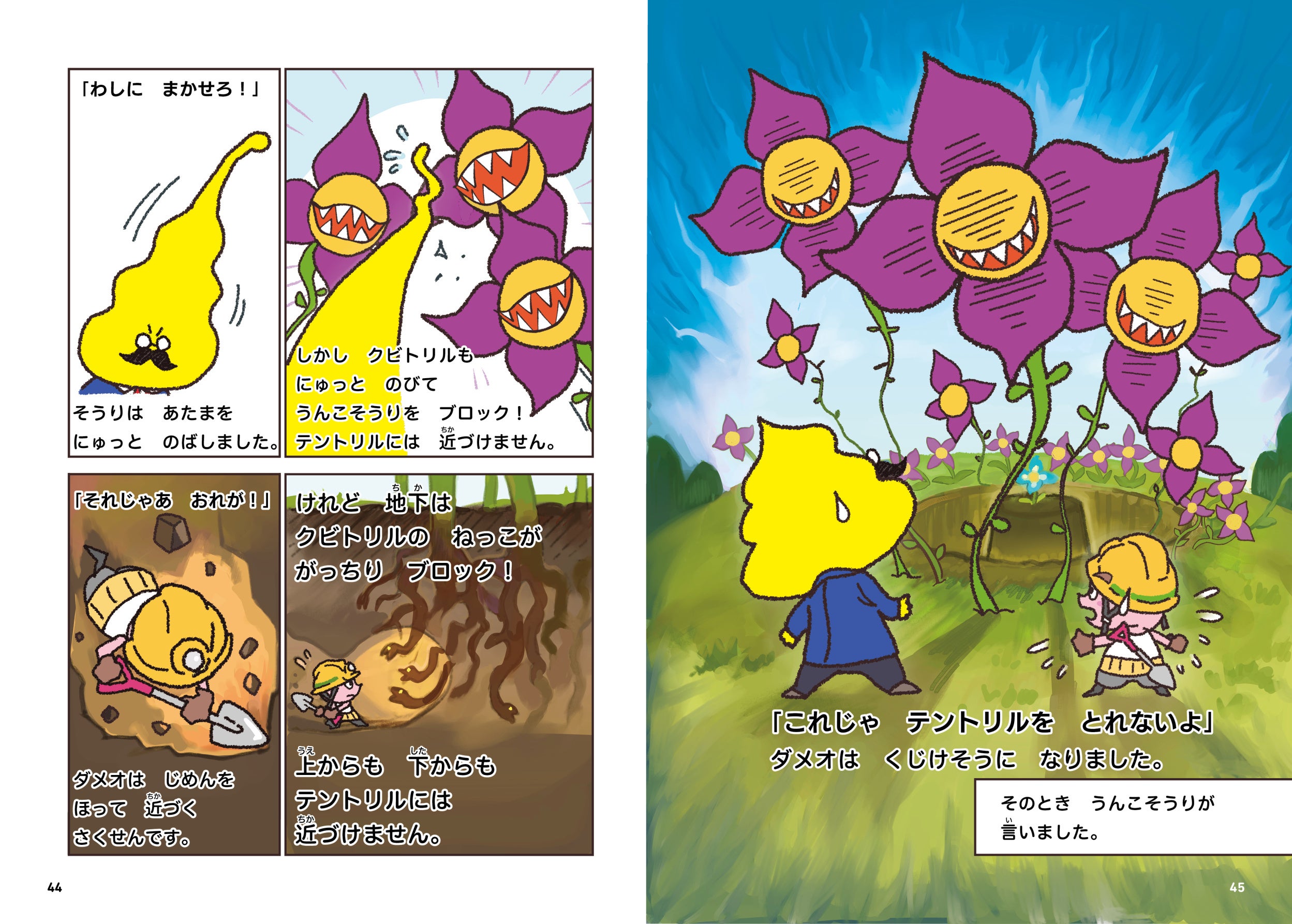うんこそうりは治療に必要な薬の素材「テントリルの花」を、もぐらのダメオと一緒に探しに出ますが、そこには数々の困難が…!
