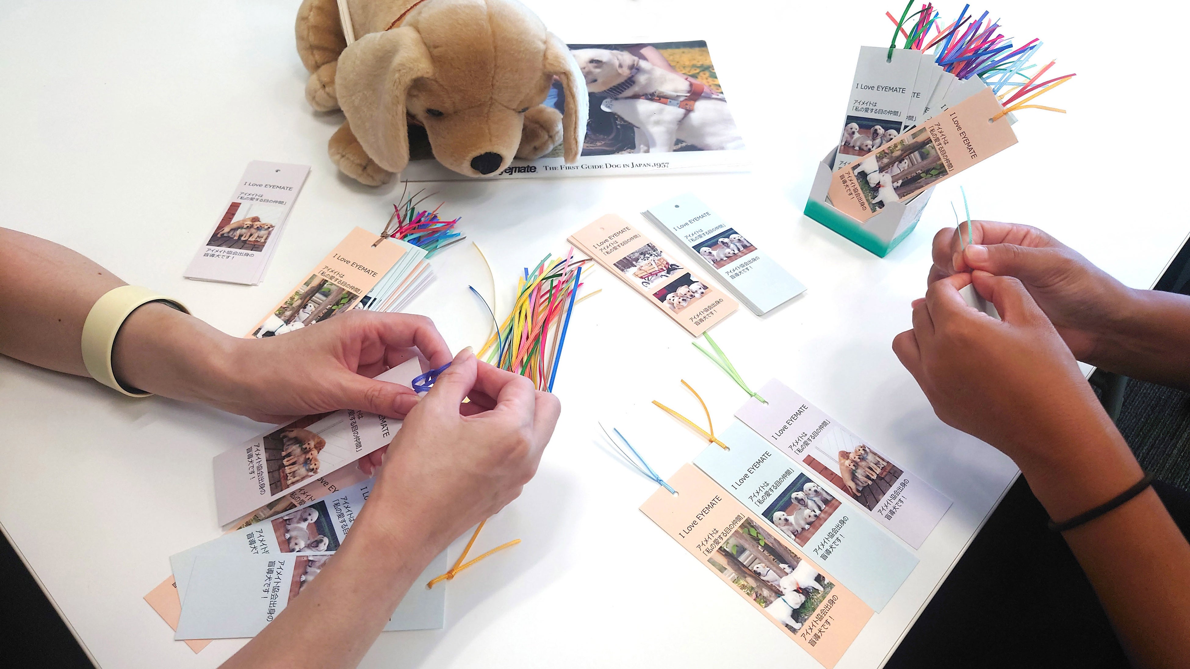 当社は1997年度より「アイメイト(盲導犬)育成による視覚障がい者の社会参加の支援」を目的として、公益財団法人アイメイト協会(代表理事:塩屋 隆男)を支援しています。当社ではアイメイト(盲導犬)と共生する視覚障がい者の方が、学校などで講演する際や街頭で募金活動を行う際に配布する「しおり」の作成に取り組んでいます。