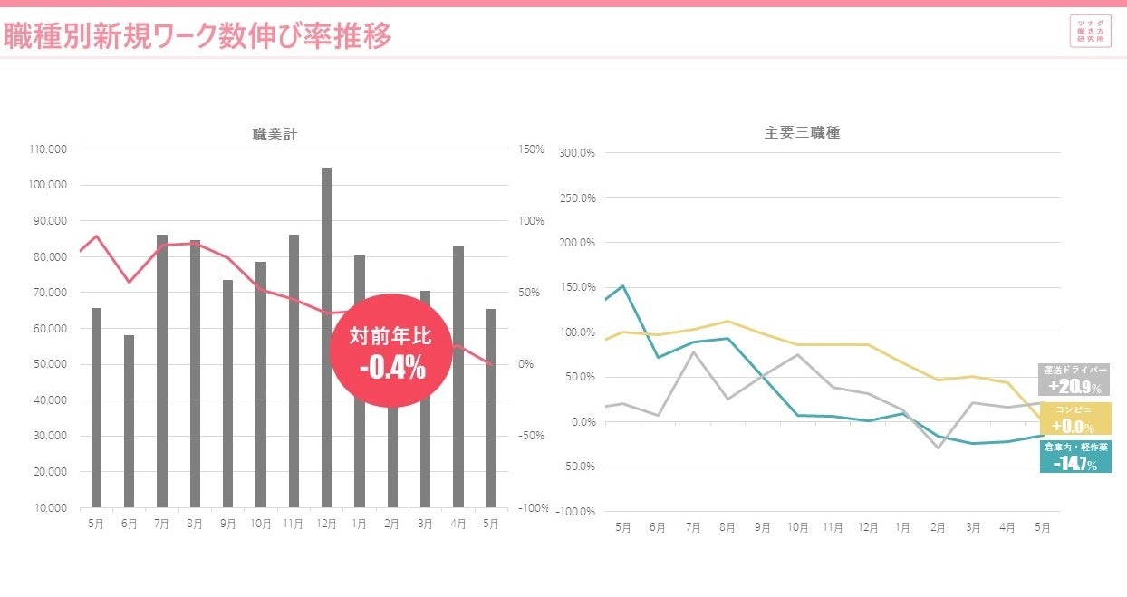 2.新規ワーク数は、対前年比で-0.4%。主要職種では運送・ドライバー系が+20.9%と伸長