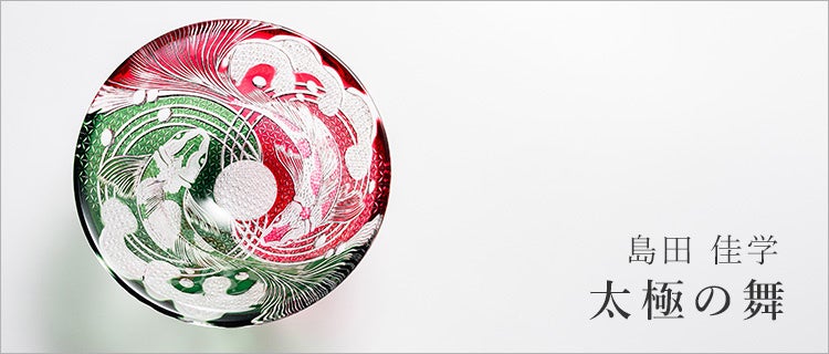 1949年創業、東京都大田区で三代続く「鍋谷グラス工芸社」。伝統工芸士・鍋谷淳一氏が率いる工房で、職人歴12年目の島田佳学氏が腕を振るいます。ひと目見て驚くのは、緑と金赤の色使い。力強く泳ぐ魚を描く欲動を、最善の図案と生地で生かしています。鯉の動きと波紋は陰陽太極図を想起させ、その間には複雑な紋様の世界が出現。鱗やひれをカットの深さで表現した細かな芸も光ります。躍動と調和、細部のユニークさが巧みに絡み合う逸品です。