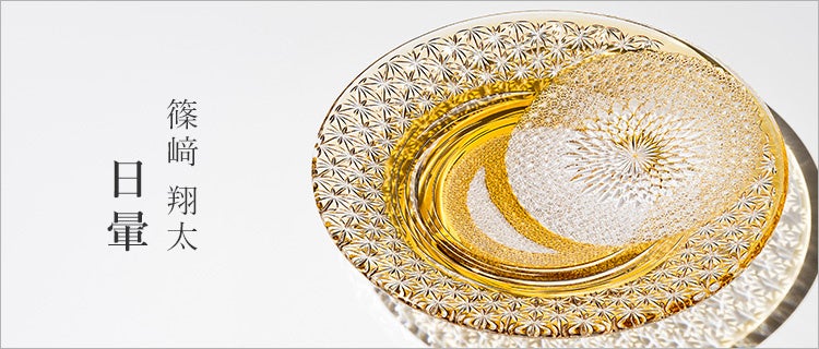 名門「篠崎硝子工芸所」の三代目・翔太氏は、エモーショナルな作風で見る者を惹きつけます。本作は、太陽光の屈折等で白く浮かび上がる「ハロ効果」を意識し、光の重なりや暖かみを描き出した意欲作。中心を大きくずらした円形の菊繋ぎは、斜め上から眺めるともう一枚皿が重なっているような錯覚を覚えます。周囲の麻の葉紋や底の菊籠目紋がシンメトリーだからこそ、この大きなズレが鮮やかに「脳をバグらせる」ような体験をもたらします。