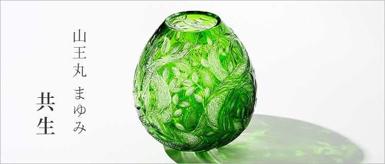 本作は、建造物に生える蔓植物から着想。菊繋ぎを人工物に見立て、そこに植物が絡まることで生まれる自然との共存を表現しています。葉や蔓を花切子の技法で浮き彫りにし、鉢全体にびっしりと配置。鮮やかなグリーンのクリスタルガラスが映える、巧みな構図をご堪能ください。