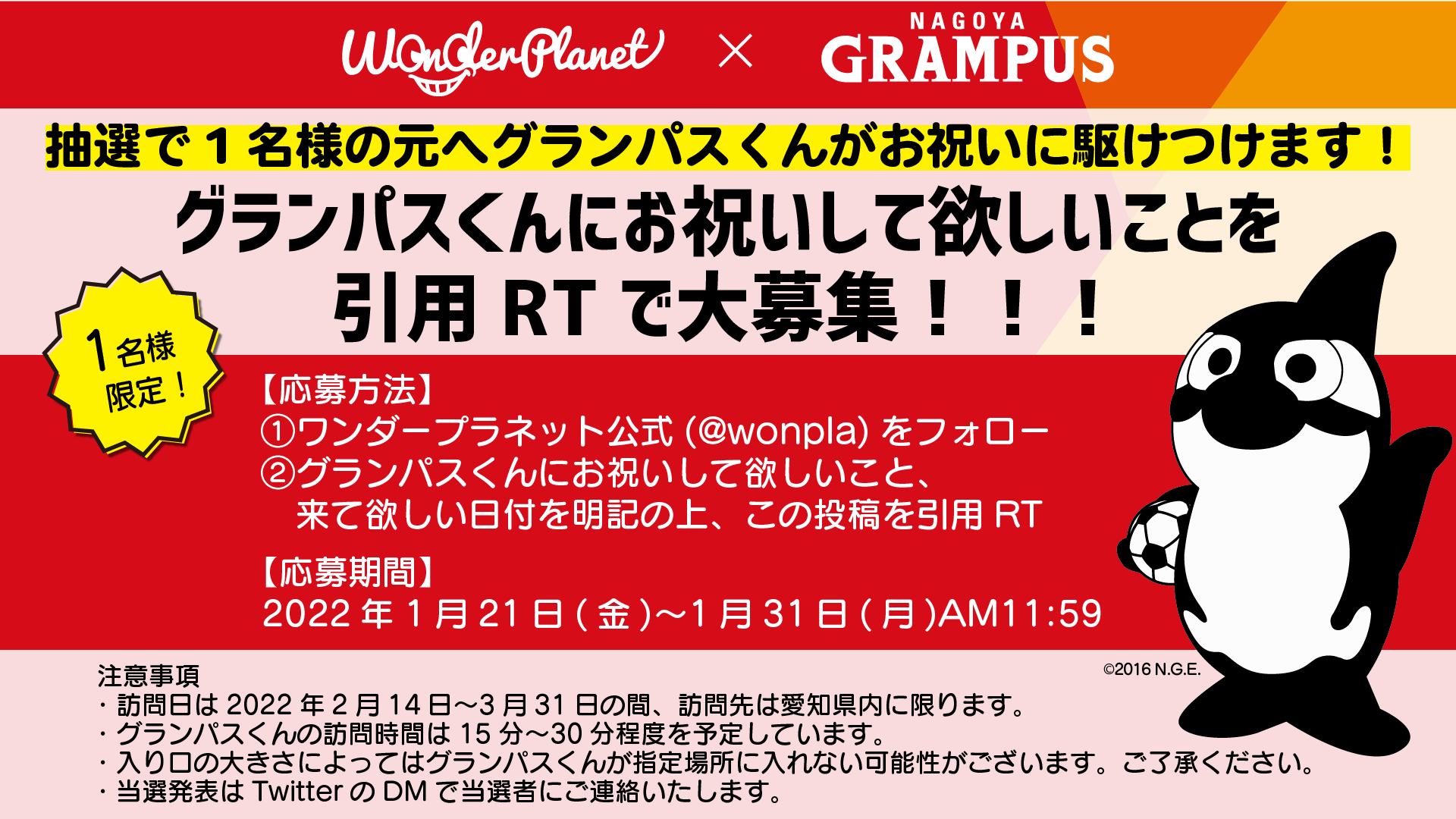エンターテインメントサービス事業を行うワンダープラネット株式会社(本社:愛知県名古屋市、代表取締役社長CEO:常川友樹、東証マザーズ上場:証券コード4199、以下当社)は、2021年よりグランパスくんファミリー応援パートナーに就任しております。グランパスファンの皆さまに「楽しいね!」の瞬間を届けるために、2022年1月21日(金)より、当社公式Twitterにてリツイートキャンペーンを実施いたします。