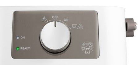 フロントパネルのダイヤル一つで電源ON/OFFからエスプレッソの予熱・抽出、スチームの予熱の切り替えまで簡単に操作可能。予熱が完了するとREADYランプでお知らせします。ミルクフロッサーも本体側面のつまみを回すだけで操作できます。