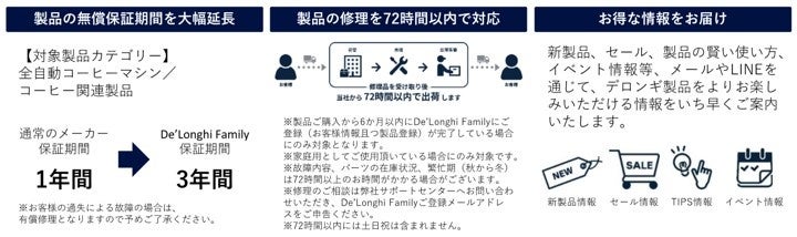 デロンギ製品をご購入いただいたお客様に、安心して製品を長くご愛用いただくため、ご購入後のメーカー無償保証期間の延長、万が一の際の迅速な修理対応といったアフターケアを大幅に拡大し提供いたします。