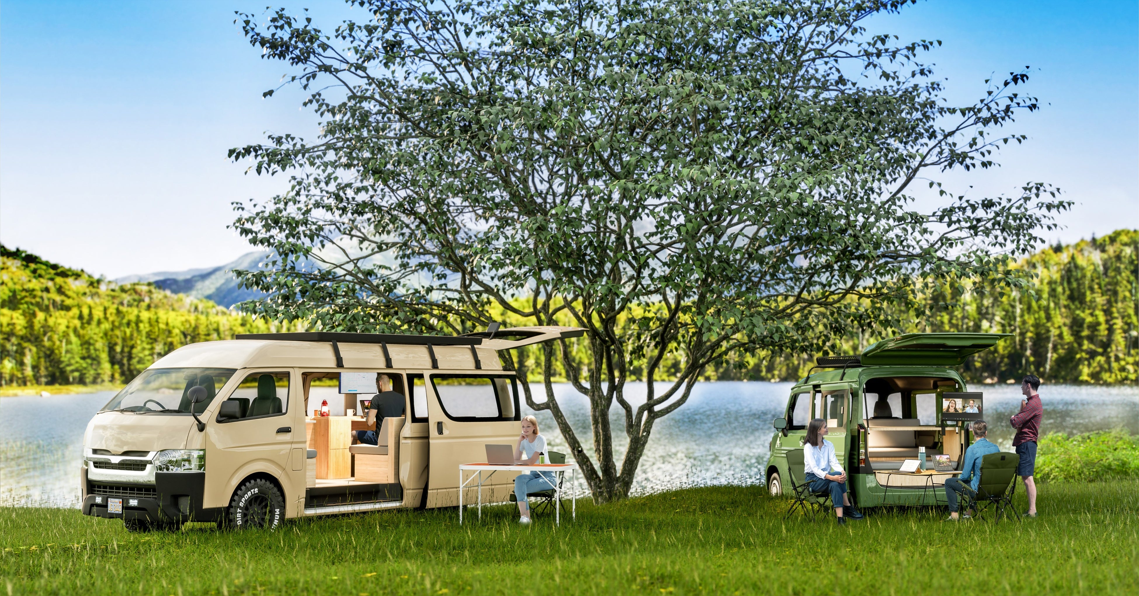 車両は、ハイエース(TOYOTA)とN-VAN(Honda)をワークスペースに架装した2種類展開で、どちらの車両も業務や気分に合わせて自由に働くスペースを選び、カスタムできる仕様となっています。