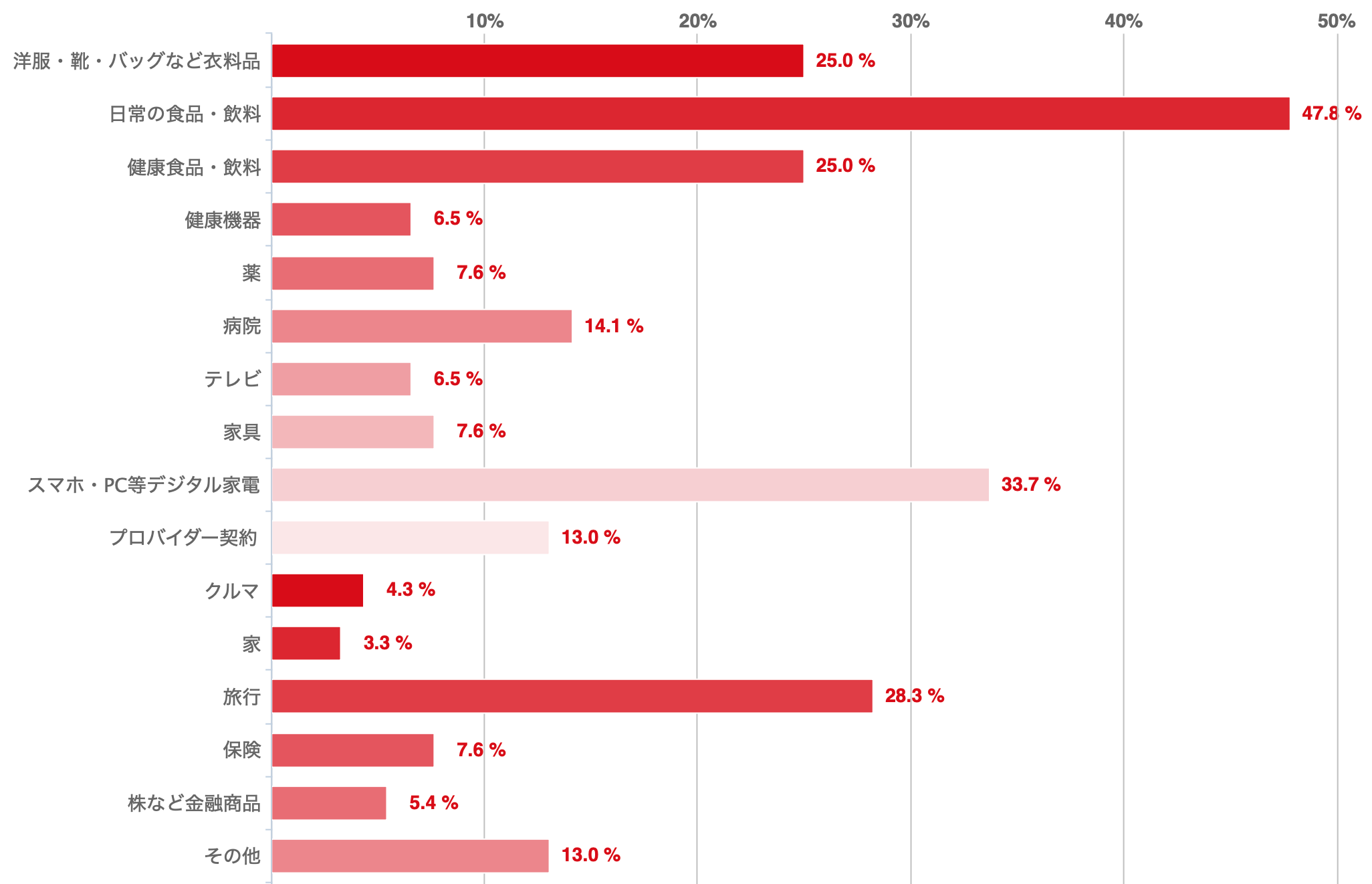 □ 洋服・靴・バッグなど衣料品 □ 日常の食品・飲料 □ 健康食品・飲料 □ 健康機器 □ 薬 □ 病院 □ テレビ □ 家具 □ スマホ・PC等デジタル家電 □ プロバイダー契約 □ クルマ □ 家 □ 旅行 □ 保険 □ 株など金融商品 □ その他