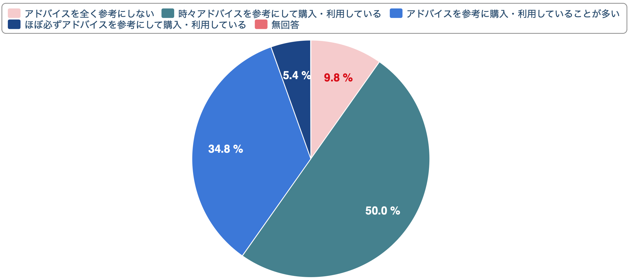 ◯アドバイスを全く参考にしない ◯時々アドバイスを参考にして購入・利用している ◯アドバイスを参考に購入・利用していることが多い ◯ほぼ必ずアドバイスを参考にして購入・利用している
