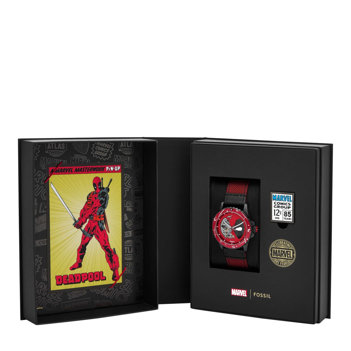 “破天荒なクソ無責任ヒーロー” デッドプールの自動巻き時計(LE1196SET ¥57,750)は、ベストセラーのフォッシル・ブルー・ダイブをベースにデザイン。この42mm径のタイムピースは、デッドプールのマスクをダイアルに配し、右目の部分から複雑な内部構造を覗かせています。バトルで負った傷をデザインした逆回転防止ベゼルと、アンチヒーローのスーツにインスパイアされた赤×黒のテキスタイルストラップが特徴です。
