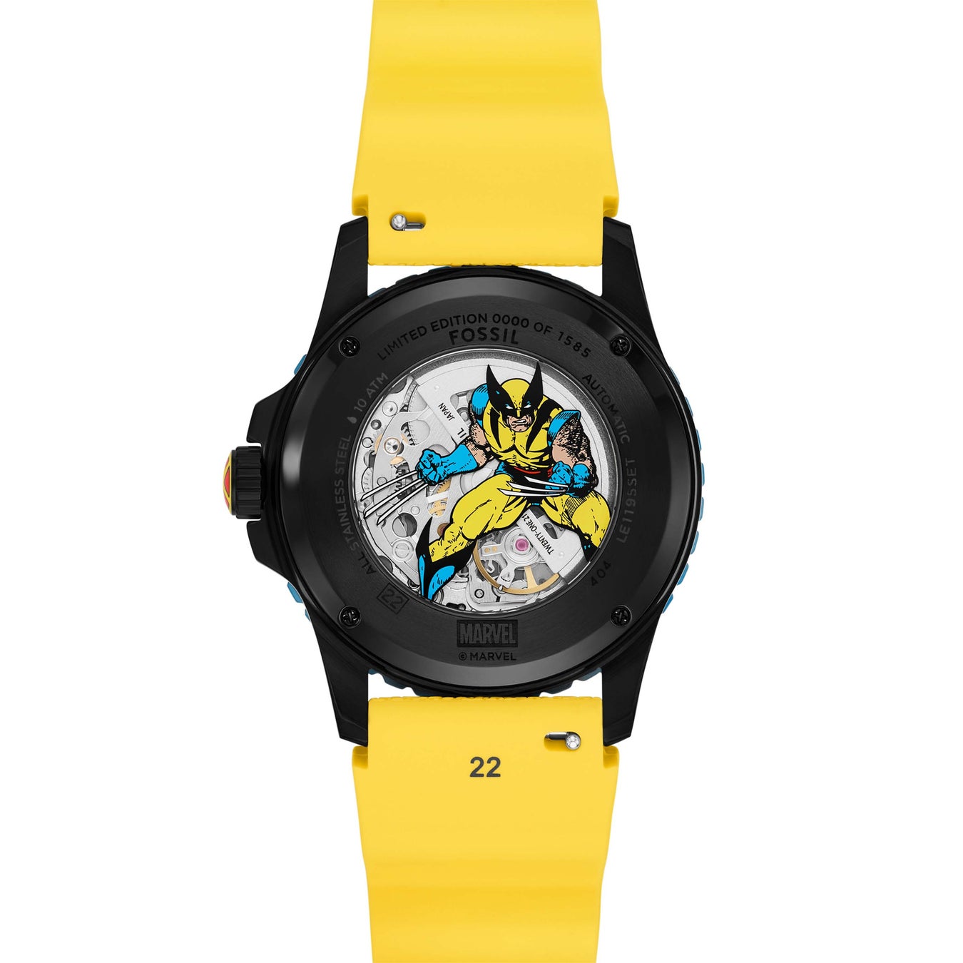 X-MENのスーパーヒーロー、ウルヴァリンの自動巻き時計(LE1195SET ¥57,750)もまた、フォッシル・ブルー・ダイブをベースにデザインされています。スーツのデザインを反映したダイアルの中心部にはオープンワークを施し、逆回転防止ベゼルには怒りの爪跡のような模様が刻まれ、イエローxブルーのシリコンストラップを組み合わせています。