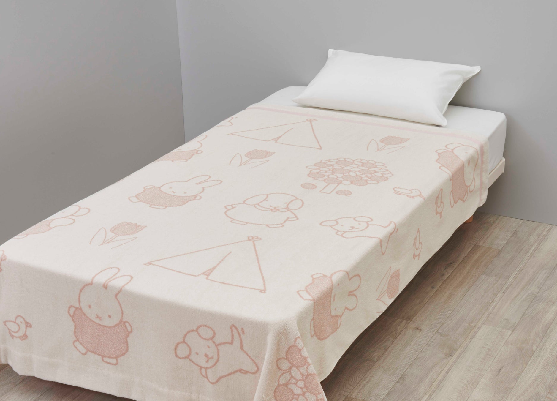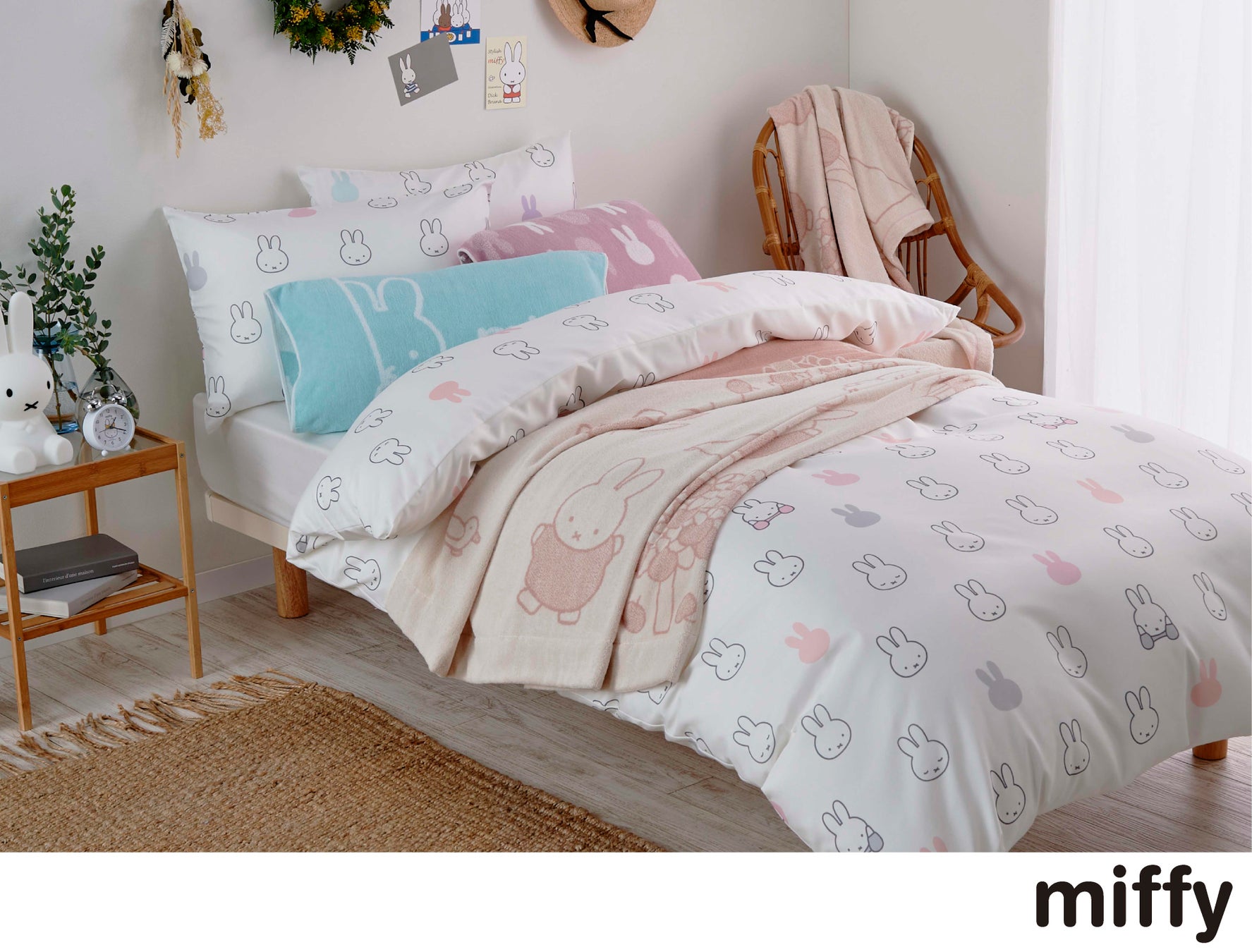 ミッフィーのお顔が並んだアートに、春夏らしいパステルカラーでアクセントをつけたカバーリングや、淡いカラーでリラックスできるタオルケットをラインナップ。