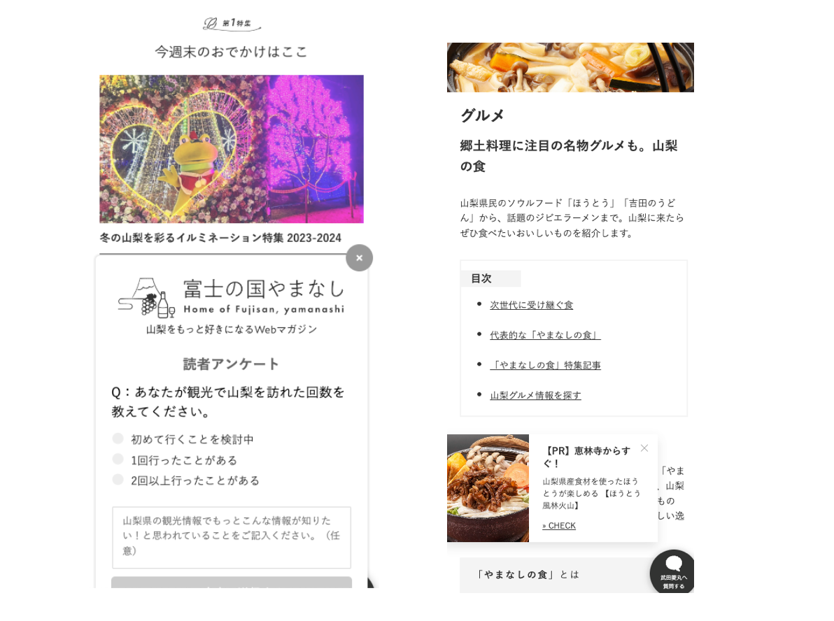 「富士の国やまなし観光ネット」は山梨県公式観光サイトとして観光スポット情報や特集記事等幅広く県内の魅力を掲載しており、観光客を中心とした月間数十万ユーザーからのアクセスがあるWebサイトです。