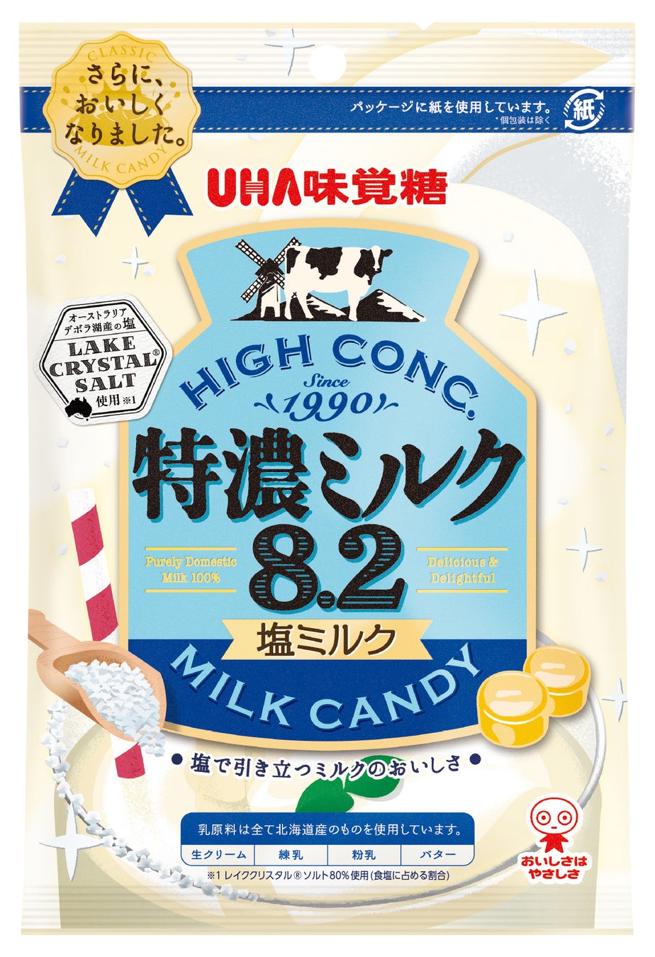 特濃ミルクに合う塩を厳選した結果、産地にもこだわったレイククリスタル®ソルトにたどり着きました。程よい塩のアクセントが加わることにより、ミルクの味わいがさらに引き立つキャンディに仕上がりました。
