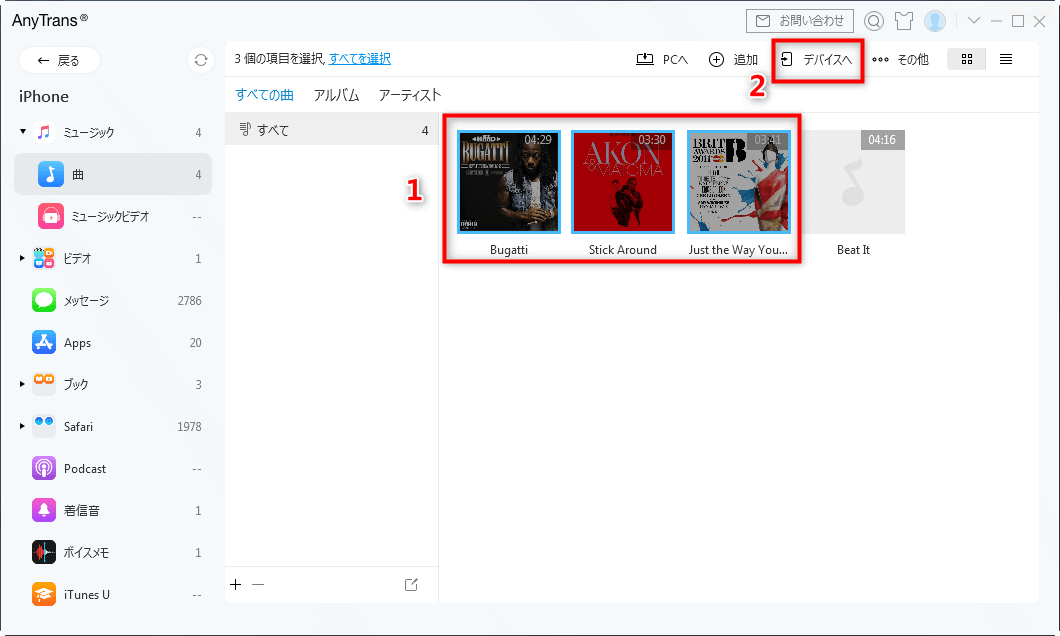 4.移行したい音楽ファイルを選択して、「デバイスへ転送」ボタンをクリックします。移動先のデバイスに音楽を転送します。