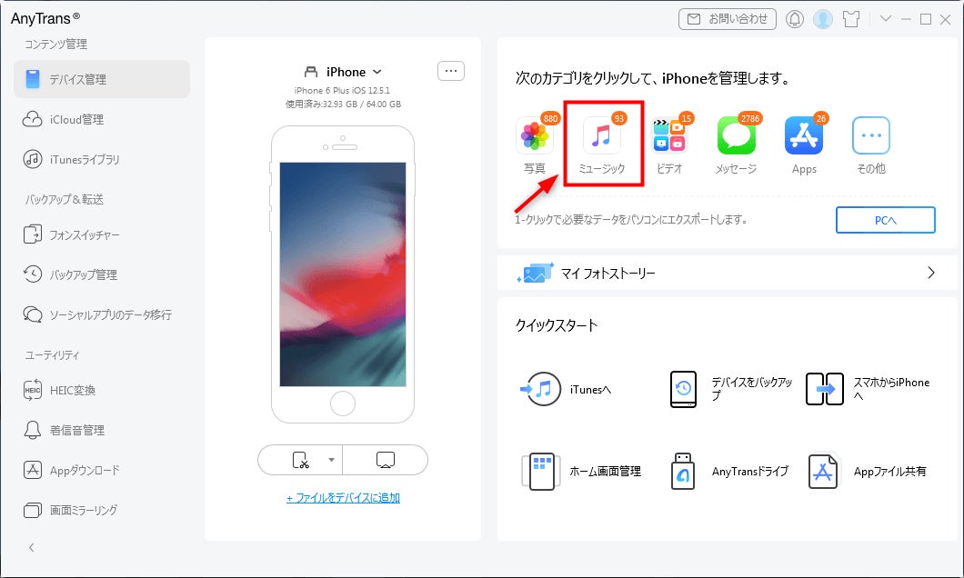 3.「デバイス管理」からi音楽を保存しているiPhoneを選択します。「ミュージック」をクリックして、当該iPhoneの管理画面に入ります。