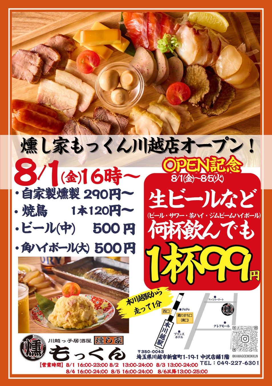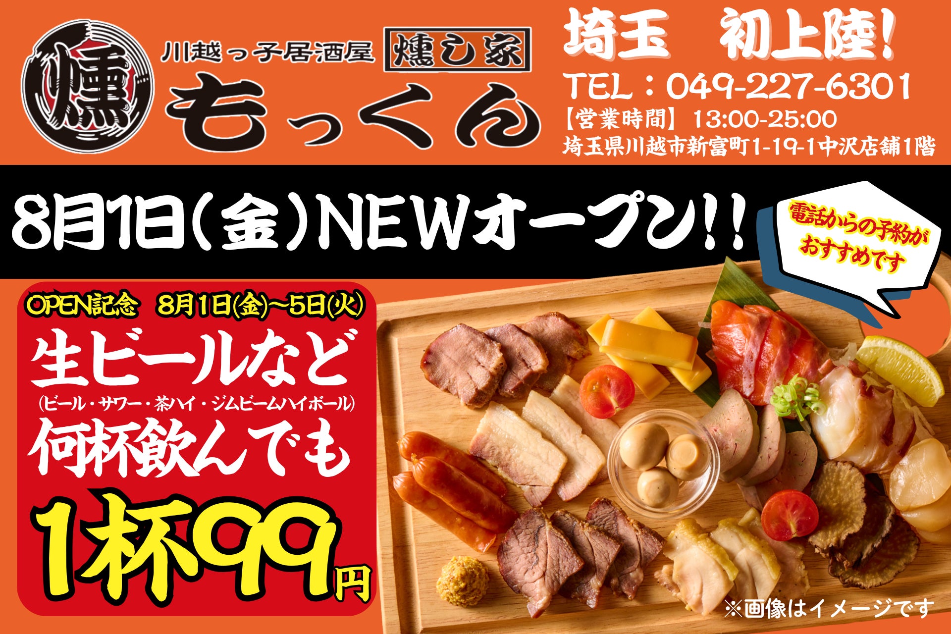 吉祥寺発の老舗燻製居酒屋『燻し家もっくん』が埼玉初上陸!川越店が8月1日(木)にオープン!8月1日(金)~5日(火)の5日間はドリンク99円!
