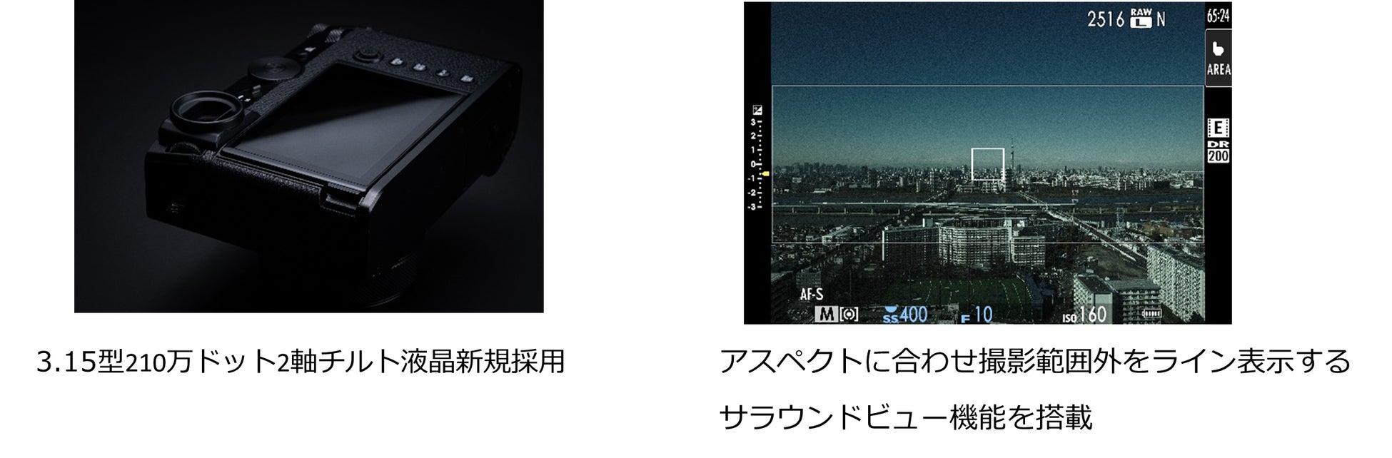 •3.15型210万ドット2軸チルト液晶モニターを新規採用し、モニターの3:2のアスペクト比に合わせて撮影時のアイコンを最適配置する新しいユーザーインターフェースを搭載。没入感の高い撮影を可能にしました。また、アスペクト比に応じて撮影範囲外を半透明やラインで表示するサラウンドビュー機能を新搭載。ファインダーを覗きながら、レバーで簡単に切り換えが可能で、EVFながらOVFのようにフレーム外を意識した撮影体験を提供します。