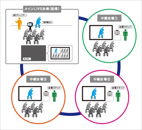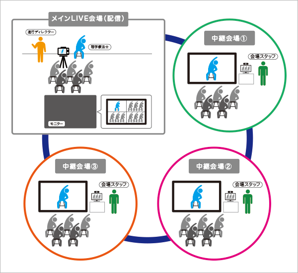 生涯ゲンキ講座は通いの場(4ヵ所)にて各施設最大20名とし、全3回で開催します。そのうち1ヵ所は対面形式、その他の施設はメイン会場で実施している内容をライブビューイング形式で上映し、開催することが特長です。プログラムの内容は、当社所属の医療従事者(理学療法士・保健師)がフレイル予防に関する知識を学ぶ座学とストレッチやトレーニングを組み合わせた運動プログラムを行います。講座終了時には参加者へアンケートを実施し、フレイルへの理解度や今後のフレイル予防への取り組み意向、対面とライブビューイングによる満足度差異などを収集することで、効果検証を図ると共に事後の取り組みに活用します。